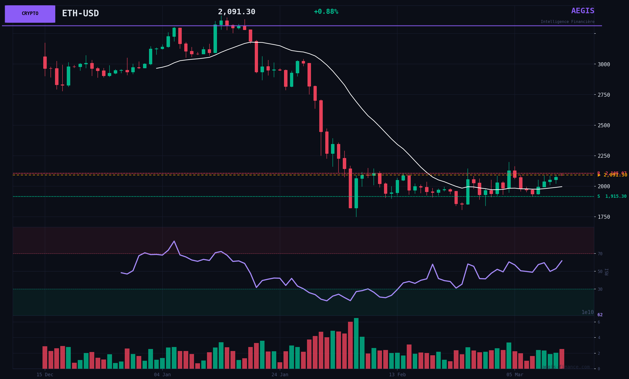 - TECHNICAL DYNAMICS Technically, ETH-USD presents a mixed picture. In the short term, the price is holding above its 20-day moving average ($1996.08), indicating positive momentum. The RSI at 61.78 confirms this relative strength without being in overbought territory. However, the long-term structure remains deeply BEARISH, with a price of $2091.30 far from its 200-day moving average ($3260.48). The asset is currently consolidating in a range defined by the support at $1804.11 and the resistance at $2198.66. The day's volume, at 117% of the average, signals increased interest but not decisive directional pressure.