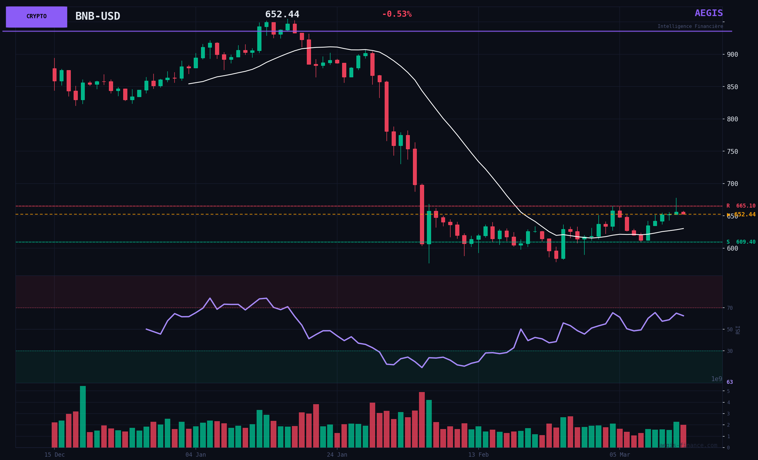 AEGIS VERDICT In a market regime in CORRECTION (SPY below MA50) and with a high VIX at 27, the context is structurally unfavorable to risk assets. BNB shows short-term resilience but faces major technical resistance at $677.75 and powerful macroeconomic headwinds. The position is NEUTRAL with a BEARISH bias, anticipating consolidation or rejection under resistance. The risk of increased volatility is high, and any directional position requires strict risk management.