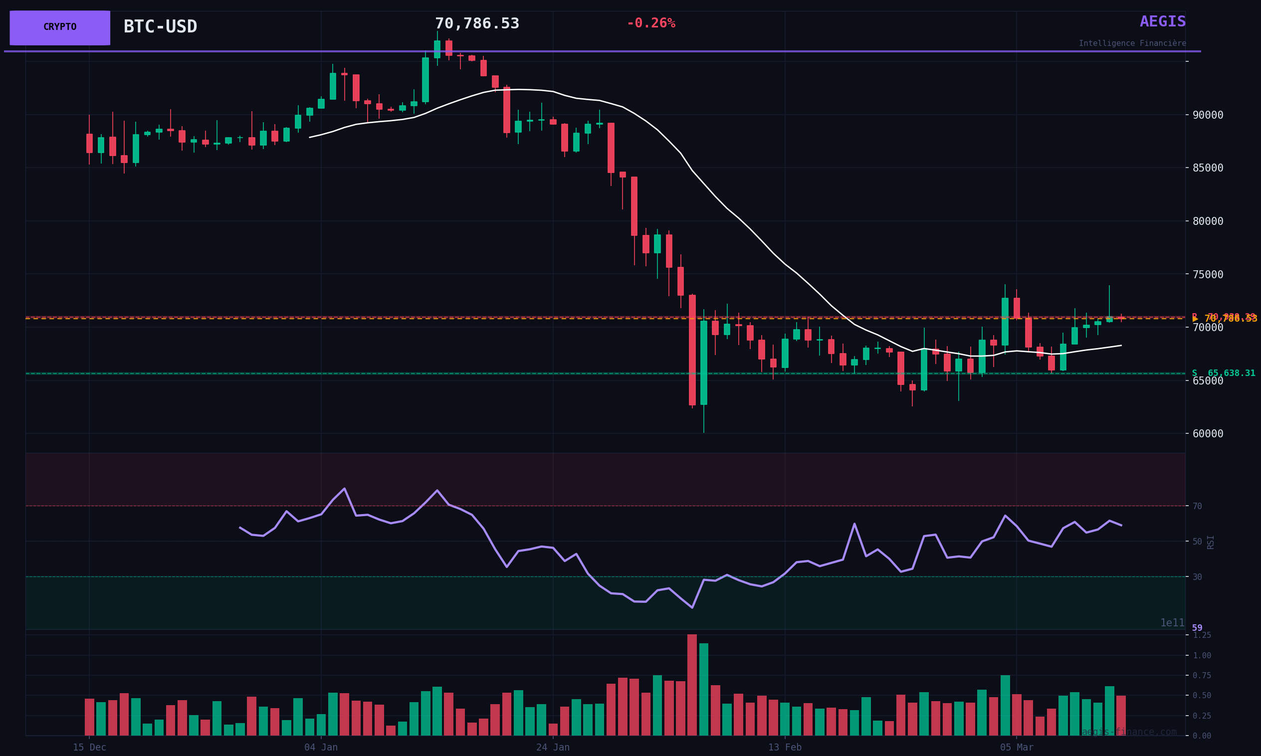 SYNTHESIS OF FLOWS Bitcoin ($BTC) shows a consolidation dynamic, oscillating around $70,800. The sequence of the last three days shows a slight progression followed by an intraday stagnation (-0.22%), with volumes at 105% of the average, indicating an engagement without strong directional pressure. However, this technical stability is in direct conflict with a degraded macroeconomic environment. The equity market regime is in CORRECTION, the VIX at 27.19 signals a high risk aversion, and the strong rise of the Dollar (DXY +0.76%) constitutes a structural headwind for risky assets. The positive micro news on the crypto sector are for the moment neutralized by the institutional prudence dictated by the macro conditions. STRUCTURE, TECHNICAL AND VOLUMETRIC Technically, BTC remains above its 20-day moving average ($68,276), which acts as a short-term momentum support. The RSI at 59 is neutral, indicating neither overbought nor oversold conditions. The asset is currently trapped in a range defined by the 30-day support at $62,553 and the resistance at $74,051. The current structure is that of a precarious balance. A break of one of these levels is necessary to define a new trend. The moderate volume suggests a lack of conviction from large operators in the current direction. SCENARIOS & CATALYSTS Base Scenario (Neutral - 55%): BTC continues to evolve in the range [$68,000 - $74,000]. The negative macroeconomic forces (high VIX, strong DXY) prevent a BULLISH breakthrough, while the technical support of the SMA20 and the persistent interest in spot ETFs prevent a major fall. Catalyst: Stagnation of macro indicators and absence of major news. BULLISH Scenario (25%): A confirmed break of the $74,051 resistance materializes, probably triggered by a relaxation in the traditional markets (VIX falling below 20, weakening of the DXY) or a very positive crypto-specific announcement (e.g., approval of a new ETF). Catalyst: Improvement of the overall risk sentiment, massive inflows into ETFs. BEARISH Scenario (20%): The price breaks the support of the SMA20 and heads towards the support of $62,553. This scenario would be activated by a further degradation of the equity markets (S&P 500 losing its MA200) or a significant outflow of capital from crypto investment products. Catalyst: VIX > 30, credit event, hostile regulation. AEGIS VERDICT In a market regime in CORRECTION (SPY under MA50) and with a high VIX at 27, the signal on Bitcoin is NEUTRAL. The asset demonstrates short-term technical resilience but faces significant macroeconomic headwinds. The current consolidation between the SMA20 support (~$68k) and the $74k resistance reflects this balance of forces. The current Risk/Reward ratio is unfavorable to an aggressive directional position taking. Caution is required until the resolution of this range.