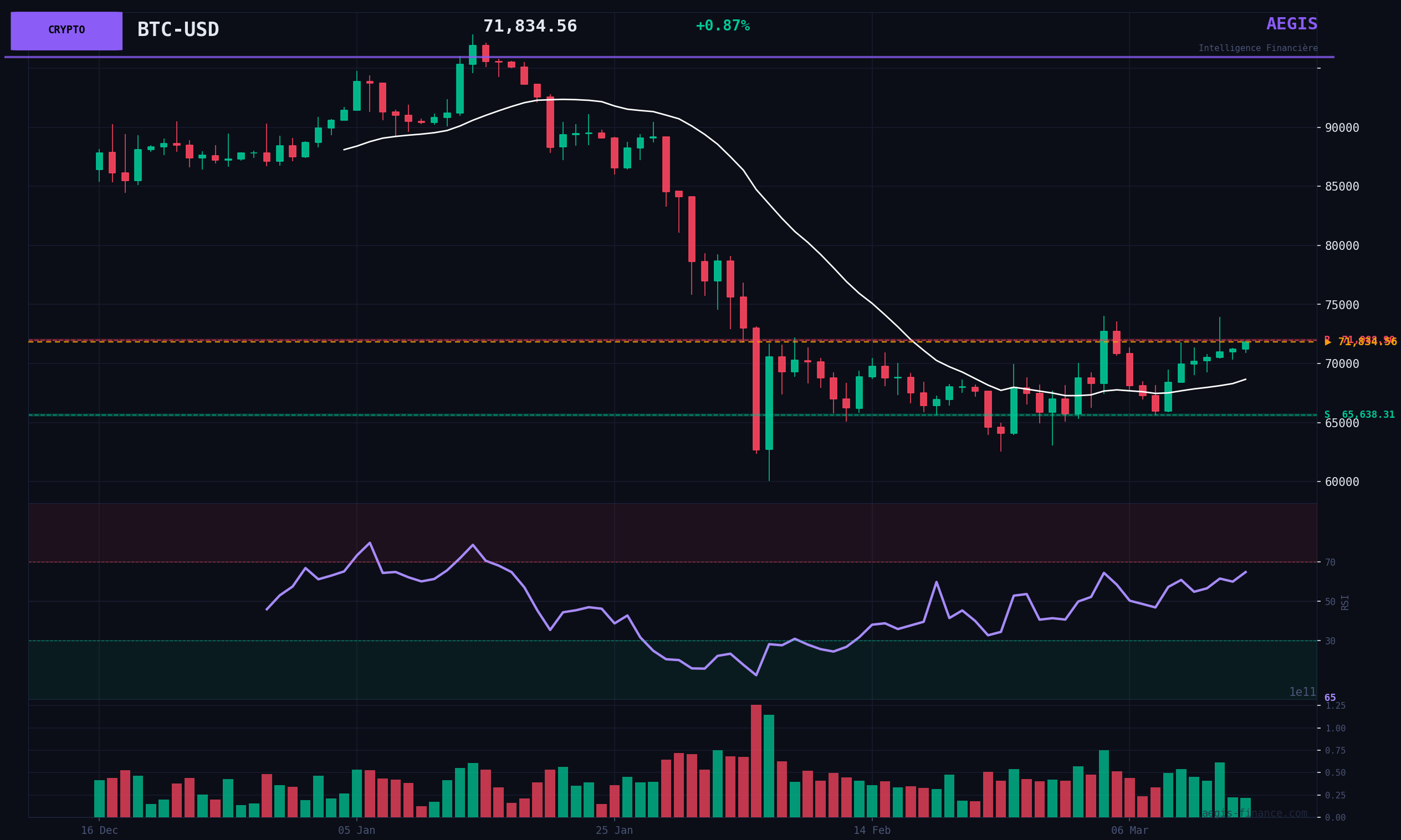 FLUX SUMMARY Bitcoin shows notable relative strength with a three-day BULLISH sequence, creating a positive divergence against the weakness of equity indices. However, the current volume, at 48% of its monthly average, indicates a lack of institutional conviction behind this rise. The macro context remains a major headwind: a high VIX at 27.19 signals risk aversion, the rising Dollar Index (DXY) weighs on risky assets, and the slight decline in HYG suggests tension in the credit market. This divergence between BTC's performance and overall risk appetite calls for caution. TECHNICAL AND VOLUMETRIC STRUCTURE The price remains above its 20-day moving average ($68,657), which constitutes the first dynamic support. The RSI at 64.84 does not indicate overbought conditions, leaving theoretical room for maneuver. The main obstacle is the 30-day resistance zone, located at $74,051. A clear break of this level, validated by a volume exceeding 150% of the average, would be a strong BULLISH signal. Conversely, a rejection below this resistance with an increase in selling volume would signal aggressive profit-taking, with a risk of a rapid return to the major support of $62,553. SCENARIOS & CATALYSTS