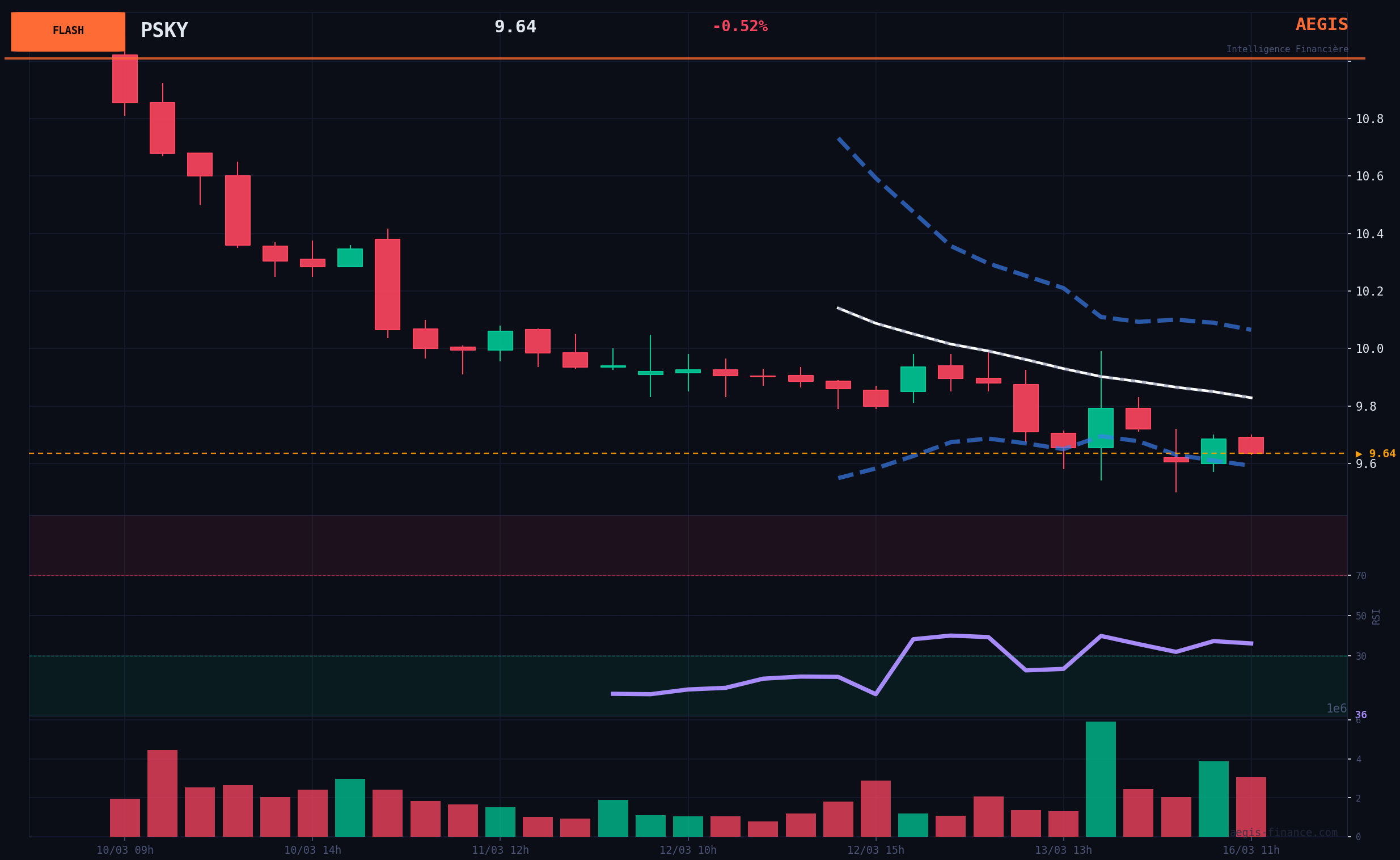 PSKY's structure is fundamentally BEARISH. The stock is trading far below its 20-day ($11.08) and 200-day ($13.78) moving averages, signaling well-entrenched negative momentum in the short and long term. The RSI at 45.23 indicates persistent weakness without being in oversold territory, leaving intact BEARISH potential. The $9.50 level represents the last 30-day technical bulwark; a clear break below this threshold, accompanied by volume, would open the way to a new phase of capitulation.