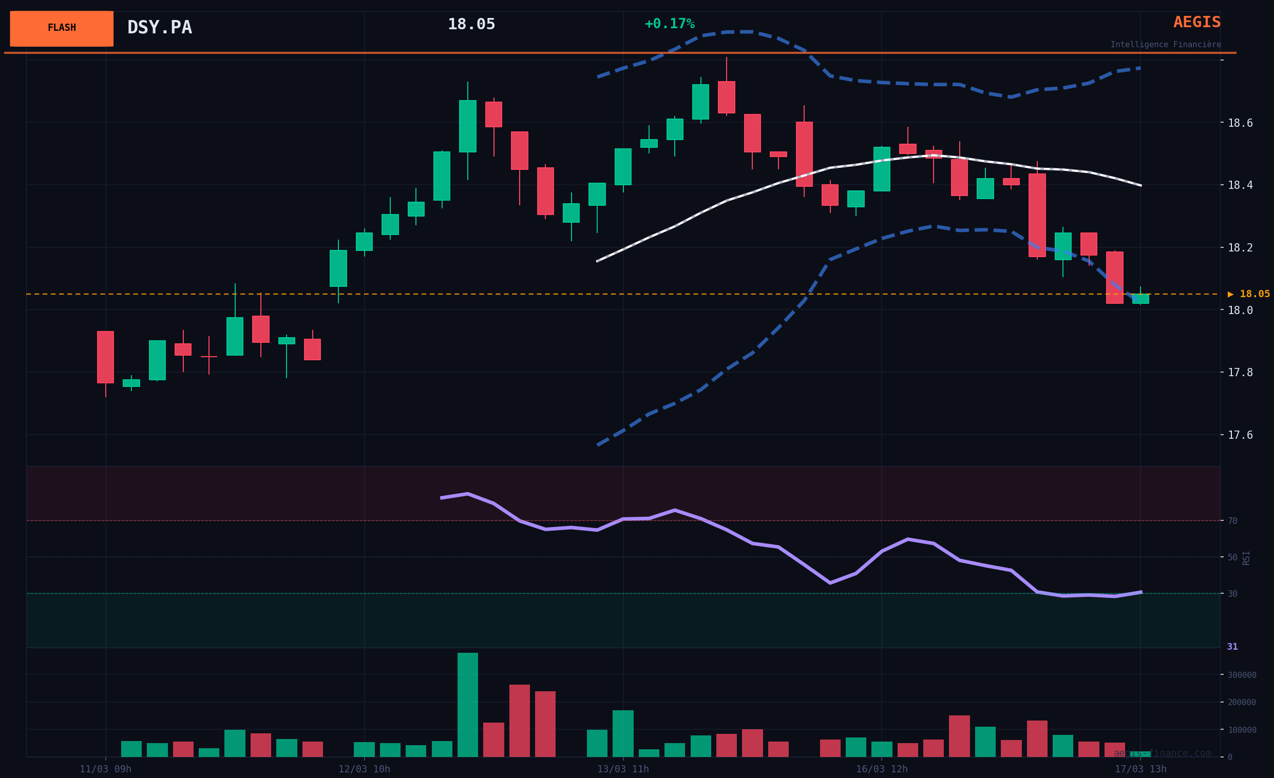 Technically, DSY.PA is currently at €18.05, just below its SMA(20) at €18.08. The RSI(14) is at 50.41, indicating NEUTRAL momentum. The 30-day support is at €15.82, while the resistance is at €23.38. The SMA(200) is much higher, at €25.72, highlighting a potentially BEARISH long-term trend. The current market regime is in a CORRECTION phase, with the CAC 40 in TRANSITION, which adds to the uncertainty.