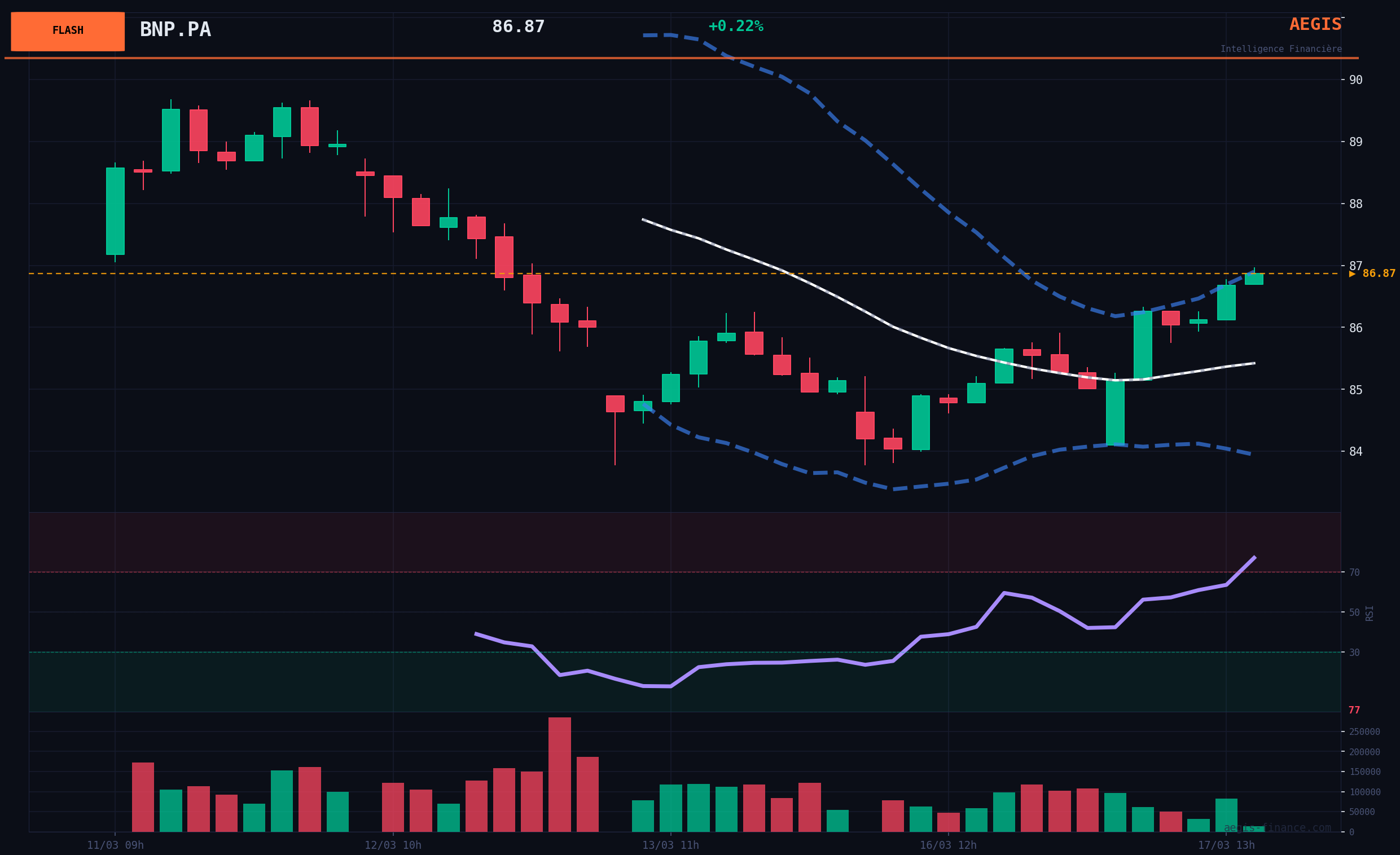 BNP Paribas (BNP.PA) experienced a sharp intraday variation of +3.28% on moderate volume, representing only 15% of its monthly average. The last three sessions show a consolidation around €84.88, preceding the current BULLISH movement. Recent news is mixed, with growth targets in asset management by 2030 deemed disappointing by some, but also announcements of accelerated growth of the asset management platform.
