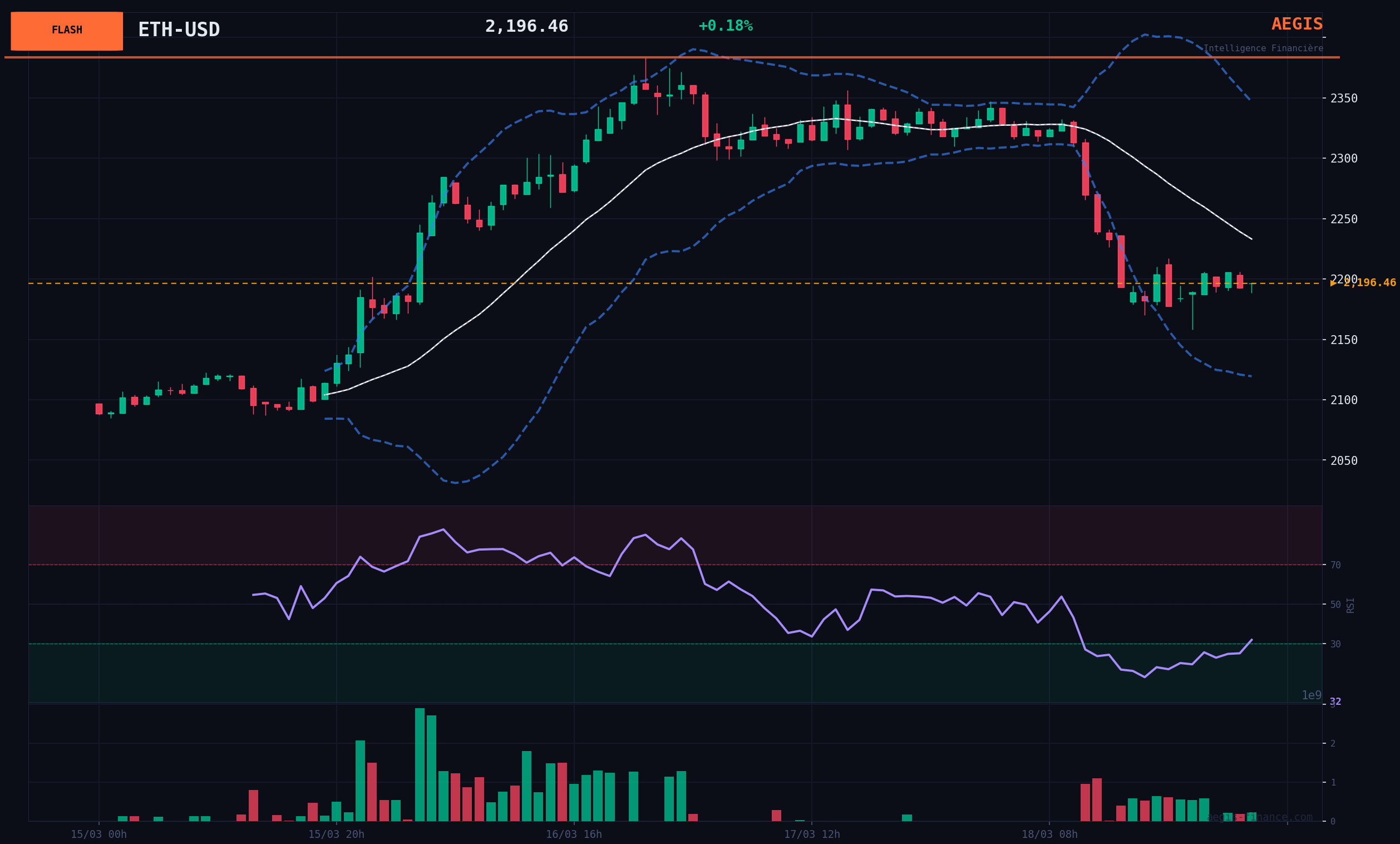 In a CORRECTION regime (SPY below MA50) and facing high geopolitical and volatility tensions (VIX > 25), the positioning on ETH-USD is tactical and NEUTRAL. The technical rebound is real but fragile, facing a global macroeconomic environment that is generally unfavorable to risk. Market flows do not show strong conviction, justifying a wait-and-see position. The base scenario favors consolidation in the $2065-2385 range in the short term.