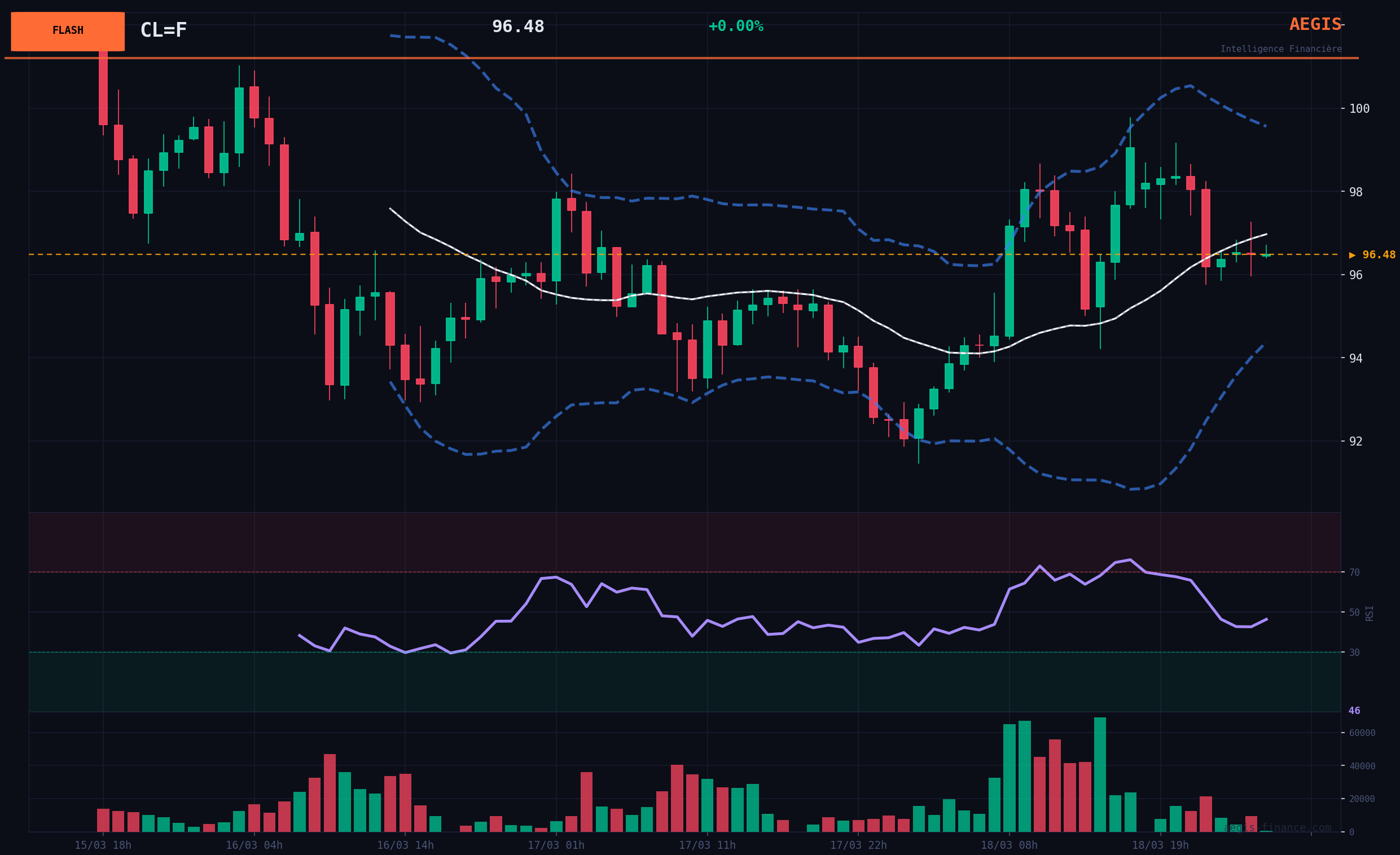 WTI Crude Oil (CL=F) is currently at $96.58. Short-term dynamics show a slight increase over the last two closed sessions, with a positive intraday variation. However, the current session shows an intraday decrease of -1.51%. The day's volume is low, representing only 16% of its monthly average.