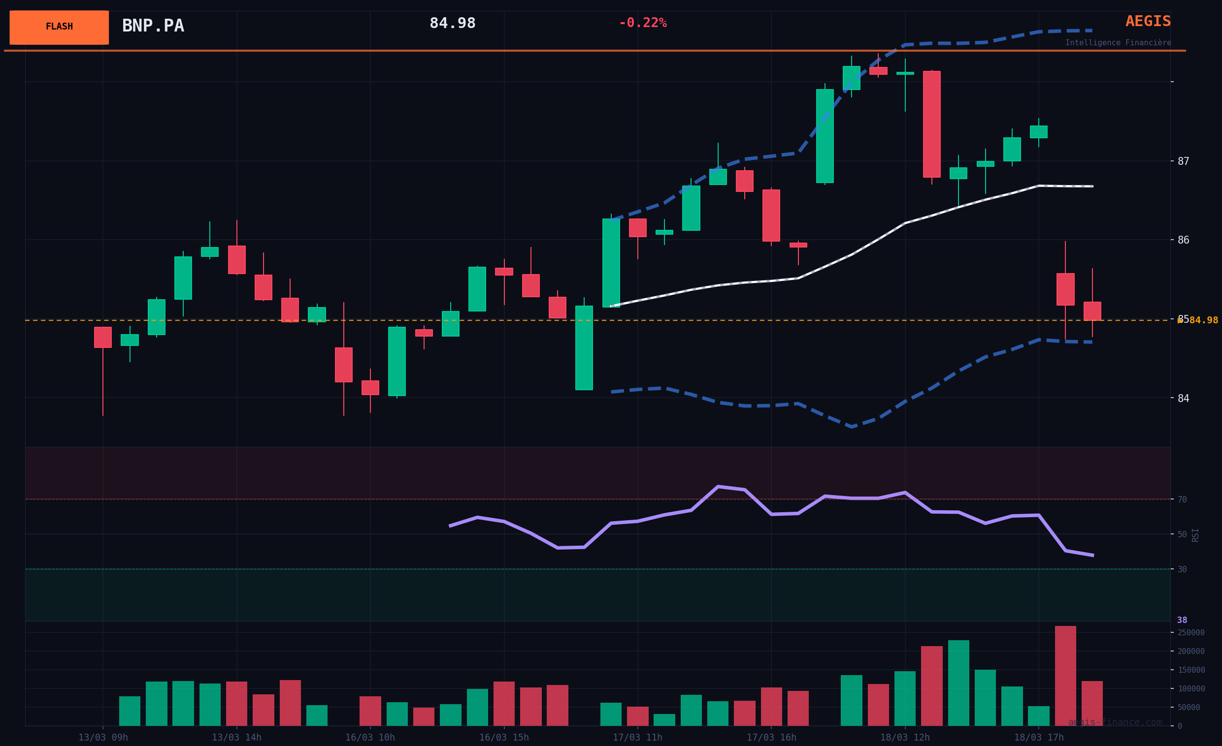 In a market regime in CORRECTION (SPY below MA50) and a context of high volatility (VIX > 25), the BEARISH signal on BNP.PA is aligned with the dominant risk-off flow. The violence of the intraday decline suggests a capitulation of short-term buyers. The preferred scenario is a continuation of the correction towards the next major support, with a price target of 79.00€. The Risk/Reward ratio of 2.33 is considered adequate for a position in line with the current market trend. Risk management remains paramount, with a stop-loss set above the recent technical resistance.