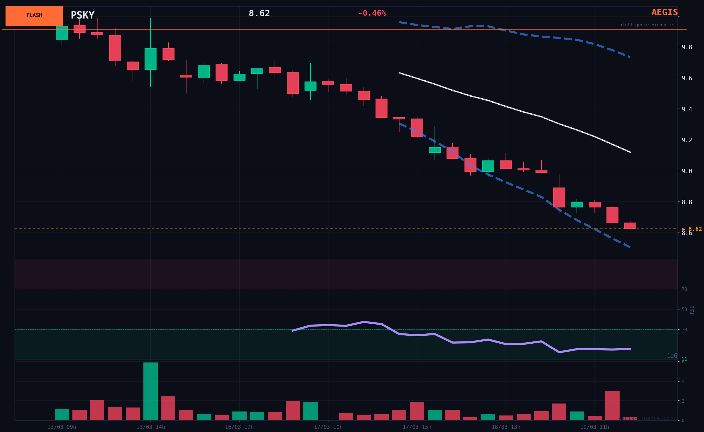 In a market regime in TRANSITION and facing critical geopolitical risk, the ongoing technical breakdown on PSKY is a major warning signal. The confluence of a deteriorating price structure, chronic underperformance relative to the market, and an unfavorable macroeconomic context justifies a BEARISH bias. High volatility (VIX > 25) reinforces the risk of erratic and violent movements. Although the RSI is extremely oversold, the absence of technical support and a positive catalyst makes a counter-trend purchase excessively risky. The preferred scenario is the continuation of capitulation.
