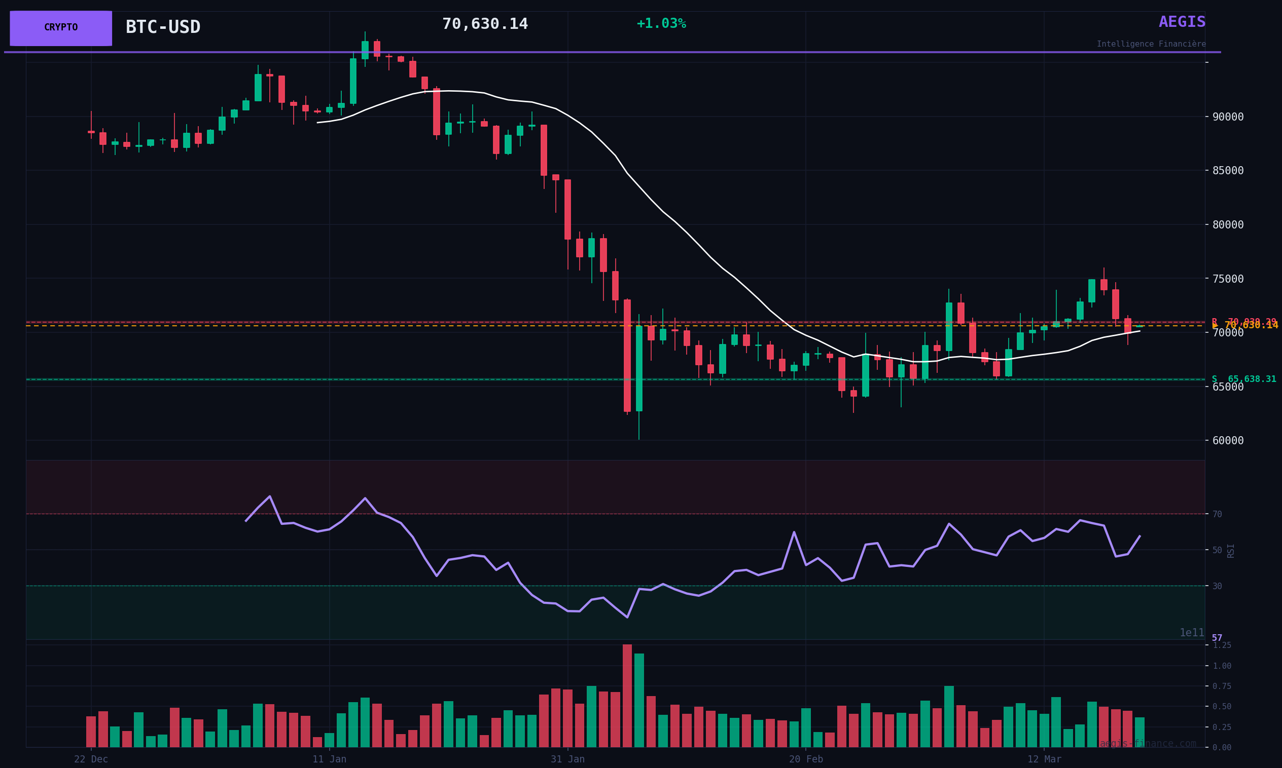 After a significant correction from highs near $74,000, Bitcoin has found a precarious stabilization zone around $70,600. The price is currently trading just above its 20-day moving average (SMA20) located at $70,115, which is the first key technical support. A break below this level would pave the way for a deeper correction towards the major support of the last 30 days at $62,553. On the upside, the main resistance is at the recent highs of $75,988. The Relative Strength Index (RSI) at 57.46 is in neutral territory, indicating a balance of forces after the recent decline. Transaction volume, at 81% of its monthly average, does not show strong conviction, neither from buyers to defend the support, nor from sellers to break it down. The structure is therefore a consolidation awaiting a catalyst.