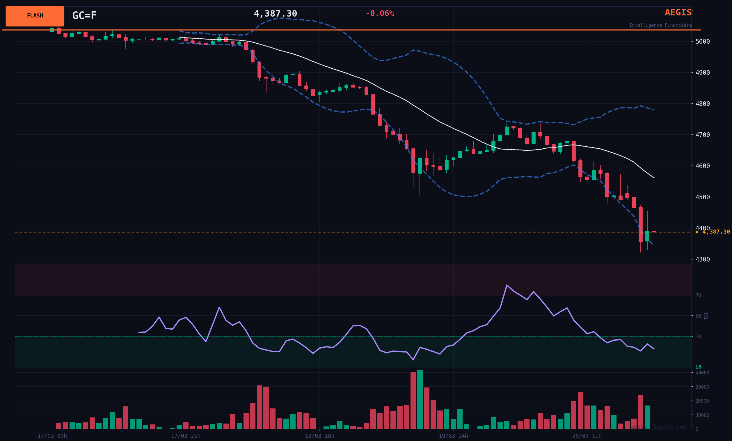 In a market regime in TRANSITION and with high volatility (VIX at 27), this BEARISH signal on Gold (GC=F) is triggered by a volumetric selling capitulation that ignores the tense geopolitical context. Macro risk remains high, requiring strict risk management. The signal is triggered on a 4-hour close below the support of $4322. The first target (TP1) is set at $4150 for partial securing, with a final target (TP2) at $4000. The protection stop is placed at $4450. Recommended sizing: Standard position (1x).