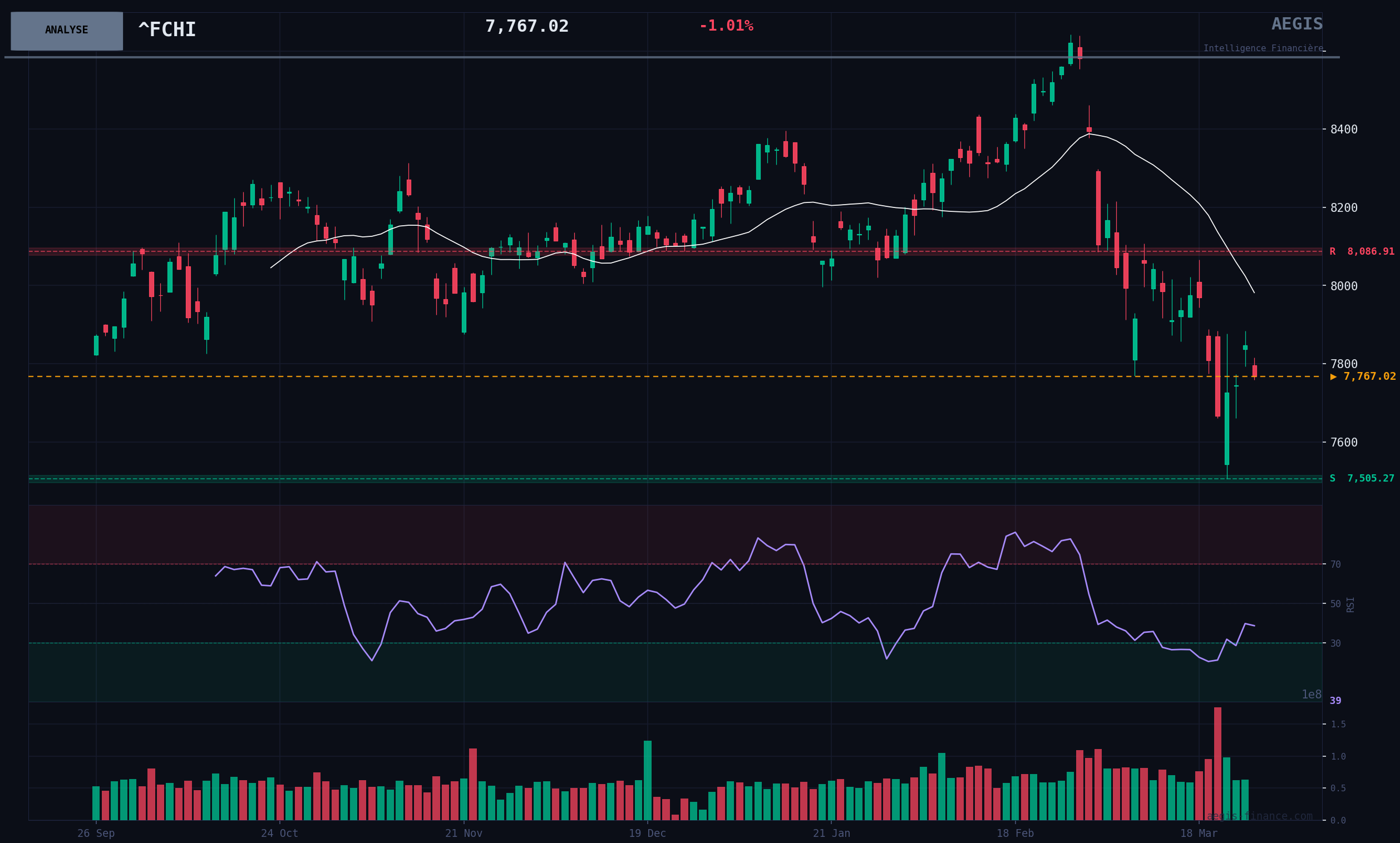 BEARISH Scenario (Probability: 80%) The most probable scenario is a continuation of BEARISH pressure. Catalysts include a further escalation of geopolitical tensions in the Middle East, higher-than-expected inflation data leading to central bank tightening, and a deterioration of economic growth prospects in Europe. A confirmed break of the 7505 point support would open the way to lower levels, potentially towards 7200 points.