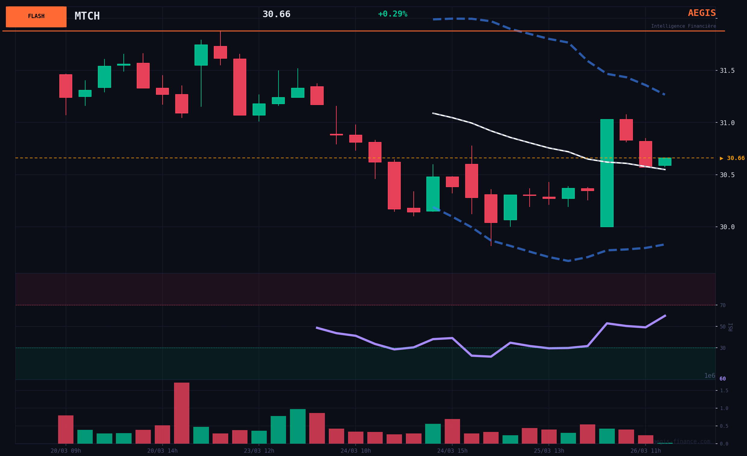 - Catalysts: A continuous deterioration of the macro-structural context, particularly an escalation of geopolitical tensions (war in Iran, Strait of Hormuz) that would push the VIX above 30 and reinforce inflation fears. A confirmed break of support at $29.55 with significant volume, or disappointing results in Match Group's upcoming publications. The persistence of low volume on technical rebounds would also validate this scenario, indicating an absence of structural demand.