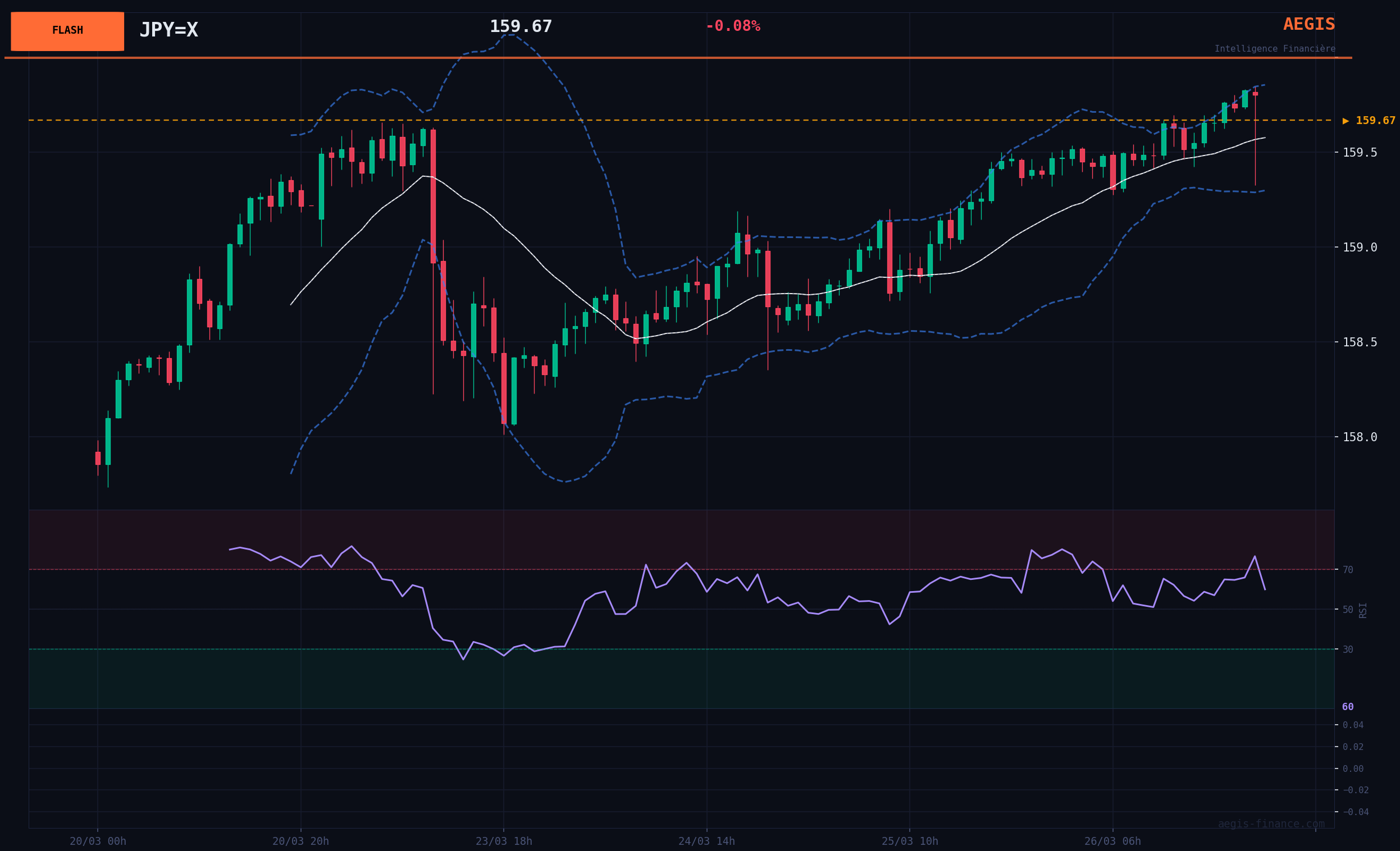 BULLISH Scenario (55%): JPY=X breaks and maintains an hourly close above the 159.85 resistance with a volume greater than the 20-period average. This movement would be fueled by the persistence of the divergence in monetary policies between a potentially hawkish Fed and a still accommodative BoJ. The continued weakening of Asian currencies in the face of geopolitical tensions (notably the Iranian conflict) and the restrictive monetary policies of other central banks (excluding Japan) would serve as a catalyst. An acceleration in the rise of the DXY, supported by robust US economic data or revived inflationary fears, would also reinforce this scenario.