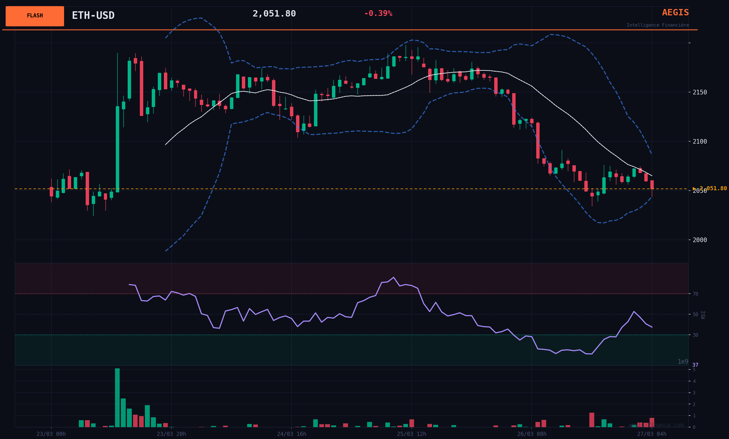 In a market regime in TRANSITION and a context of critical geopolitical risk (RAS > 75), this BEARISH signal on ETH-USD is a direct response to the technical breakdown and the deterioration of global risk sentiment. Extreme volatility, materialized by a VIX at 27.44, requires maximum caution. The signal triggers on a confirmed H4 close below $2050. The first target (TP1) is set at $1950 for partial securing. The final target (TP2) targets the major support at $1837.30. Recommended sizing: Reduced position (0.5x).