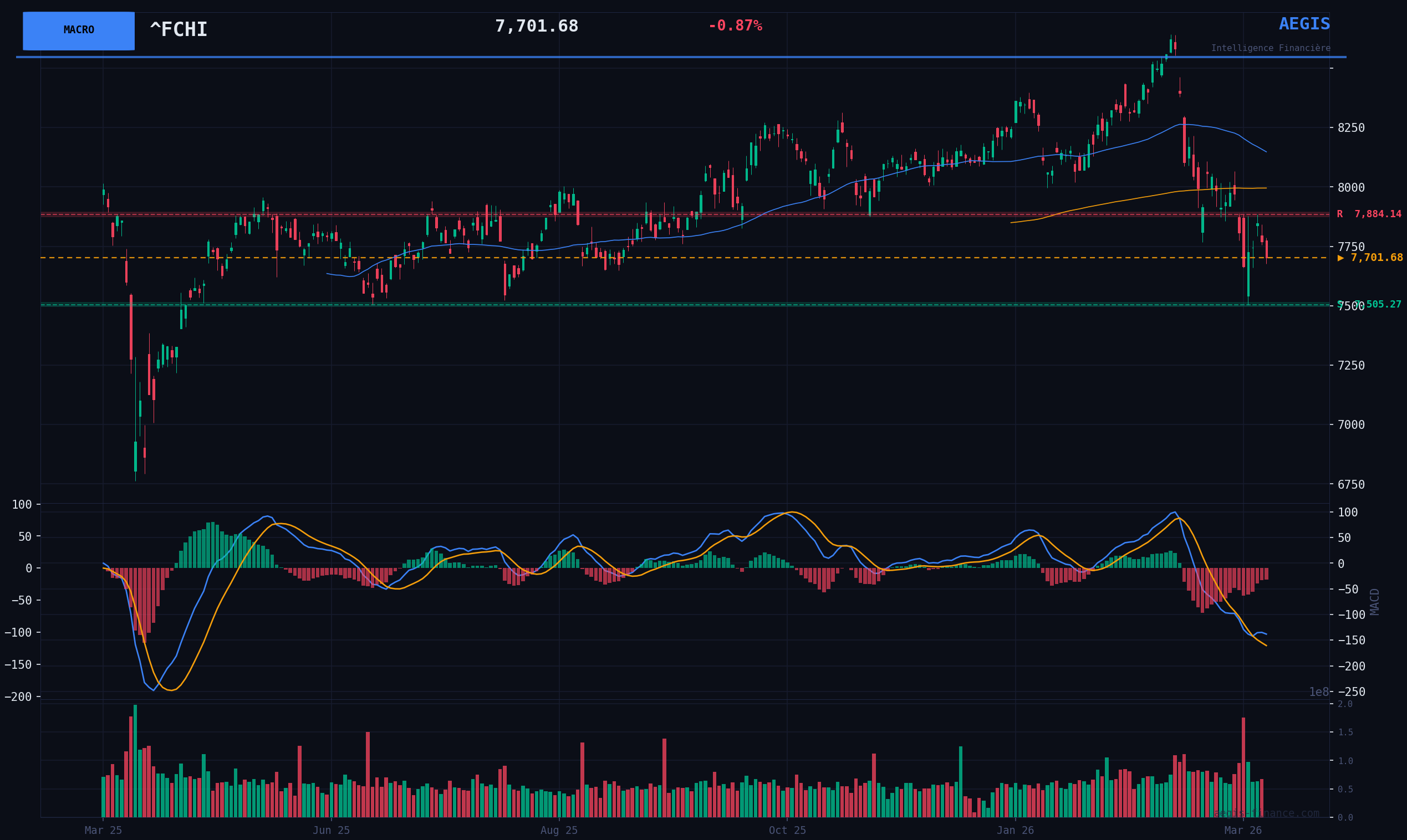 BEARISH Scenario (Probability: 70%) The current trend continues, fueled by the persistence of geopolitical risk. The CAC 40 breaks through intermediate supports to test the 7505 pts zone. This scenario is supported by a VIX remaining above 25 and a continued degradation of risk assets.