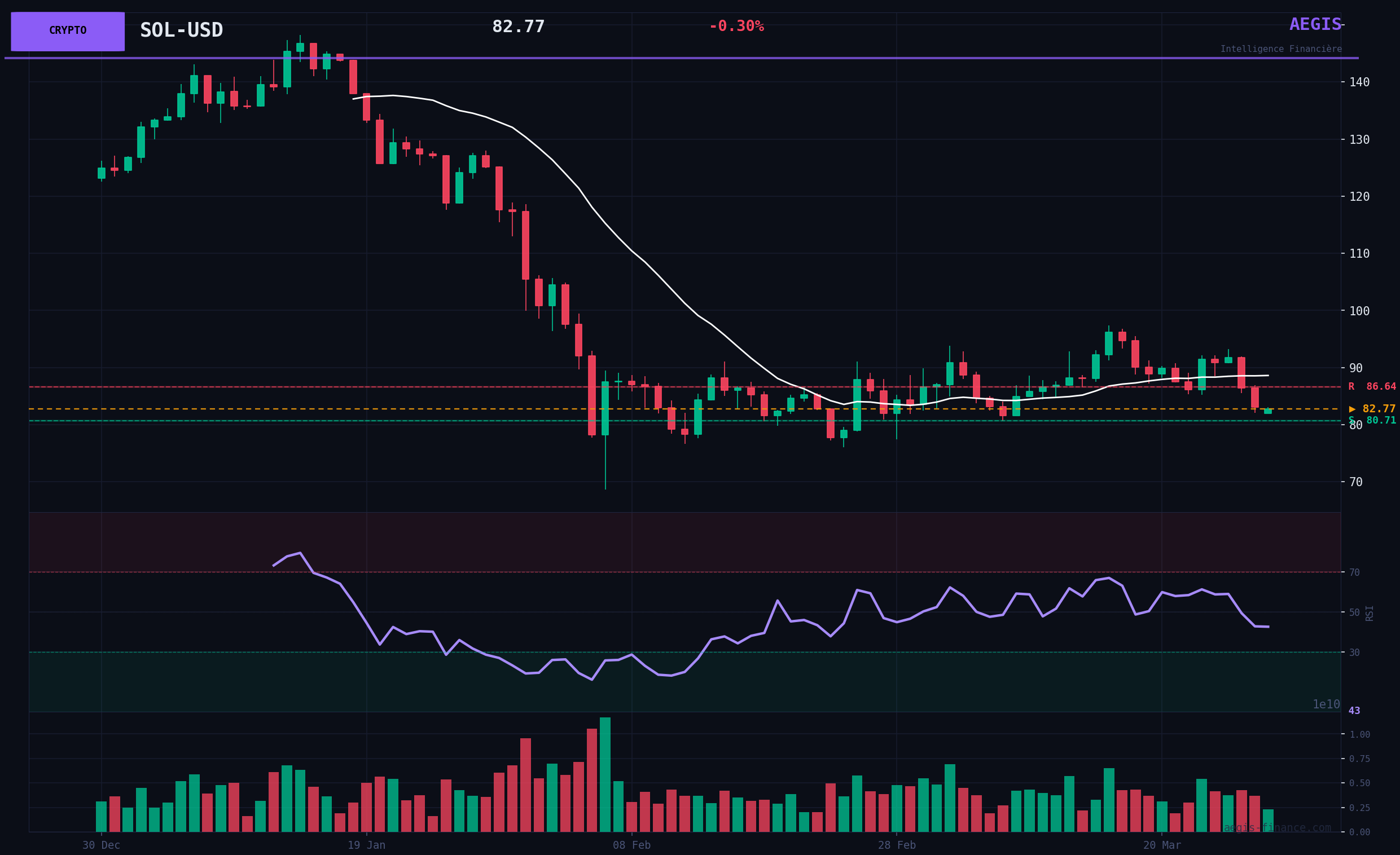 Base Scenario (25%): The market finds temporary support at the $77.45 level. SOL-USD enters a consolidation phase between this floor and the SMA20 resistance (around $88), awaiting clarification of the macroeconomic context. Volatility remains high but without a clear direction.
