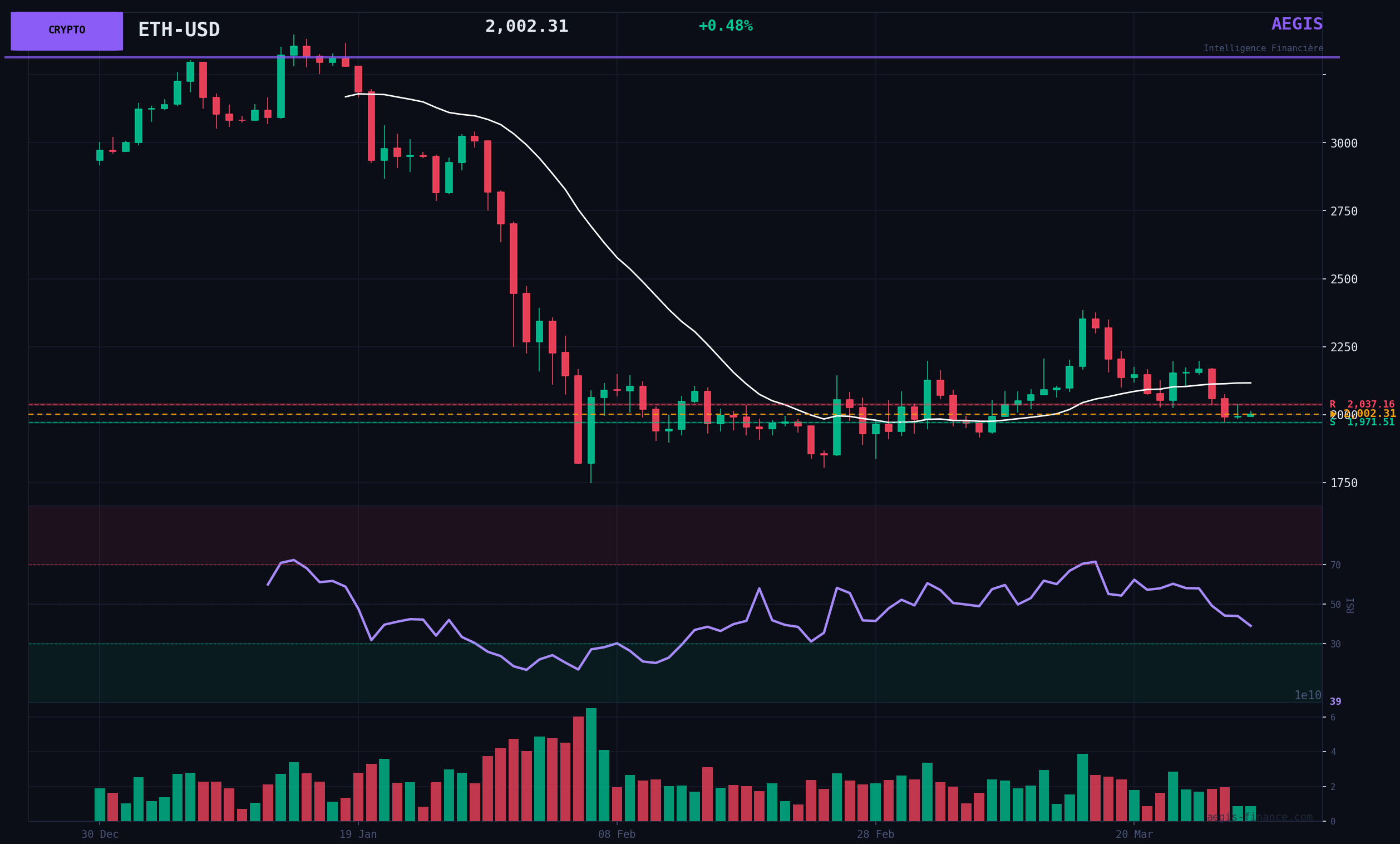 Ethereum's technical structure is clearly BEARISH. The price is trading 35% below its 200-day moving average (SMA200 at $3081) and significantly below its SMA20 ($2116), confirming a negative underlying trend. The session of March 27 was marked by a selling capitulation, with a decrease of -3.31% on high volumes. Since then, the price has been attempting to stabilize on sharply declining volumes, a sign of a pause but not a reversal. The RSI at 39.02 is in BEARISH territory and still has room before reaching extreme oversold levels. The market is currently consolidating in a narrow range between the psychological support of $1990 and the local resistance around $2060. The major support to watch is at $1837.30.