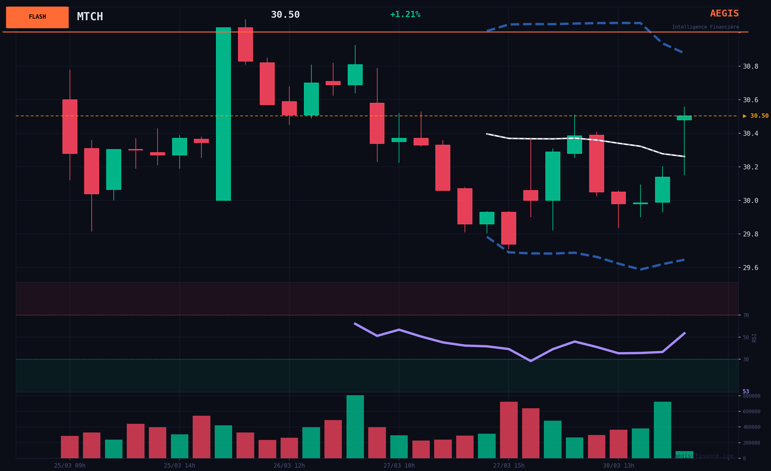 Technically, the MTCH stock is evolving in a consolidation phase. The current price of $30.50 is stuck below its 20-day moving average ($30.69) and significantly below its 200-day average ($32.90), which constitutes a major structural resistance. The key short-term support is at $29.70, while the support for the last 6 months is anchored at $28.81. The RSI (14) at 49.34 is perfectly NEUTRAL, and the extreme weakness of daily volumes (2% of the average) confirms market indecision and the absence of marked institutional interest to initiate a directional movement.