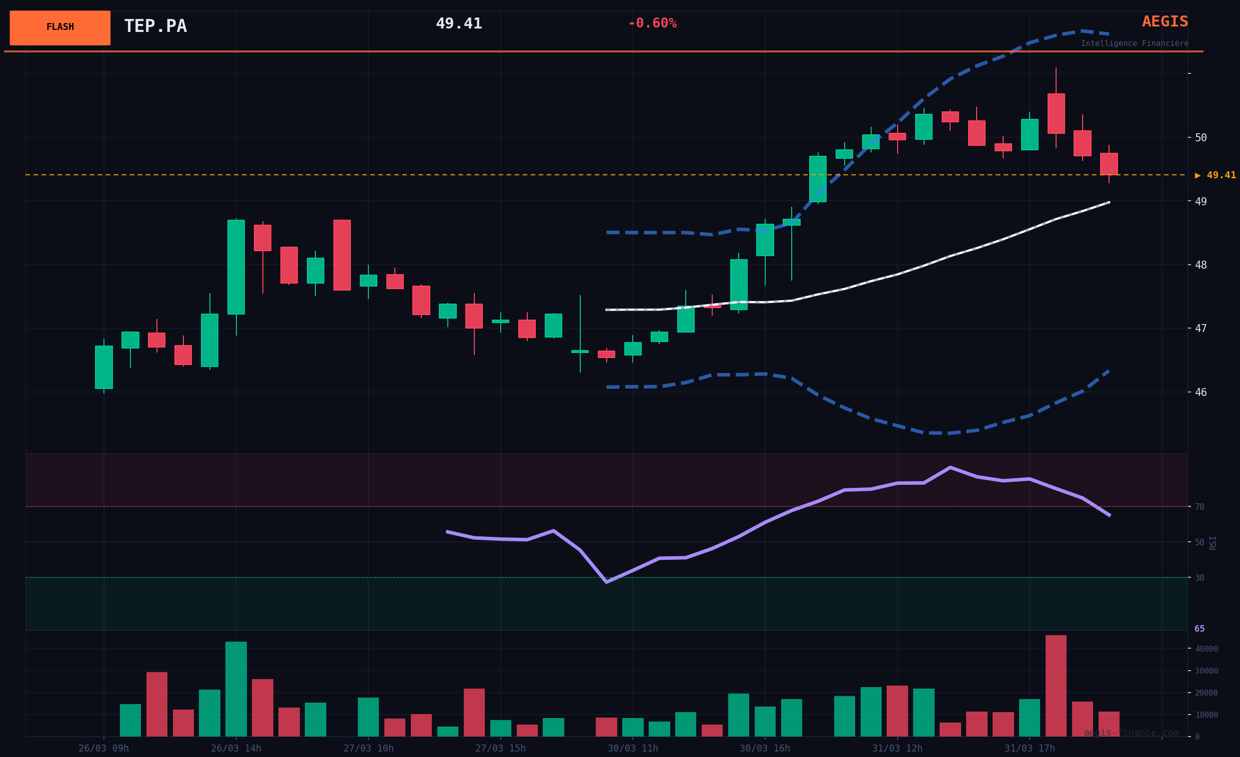 BEARISH Scenario (35% probability): Support breakdown. A degradation of the geopolitical context (already critical) or a resurgence of risk aversion in the markets pushes the stock to break its key support of €45.50. Catalysts: VIX sustainably above 25, breakdown of supports on the CAC 40, volumetric selling flows on the stock.