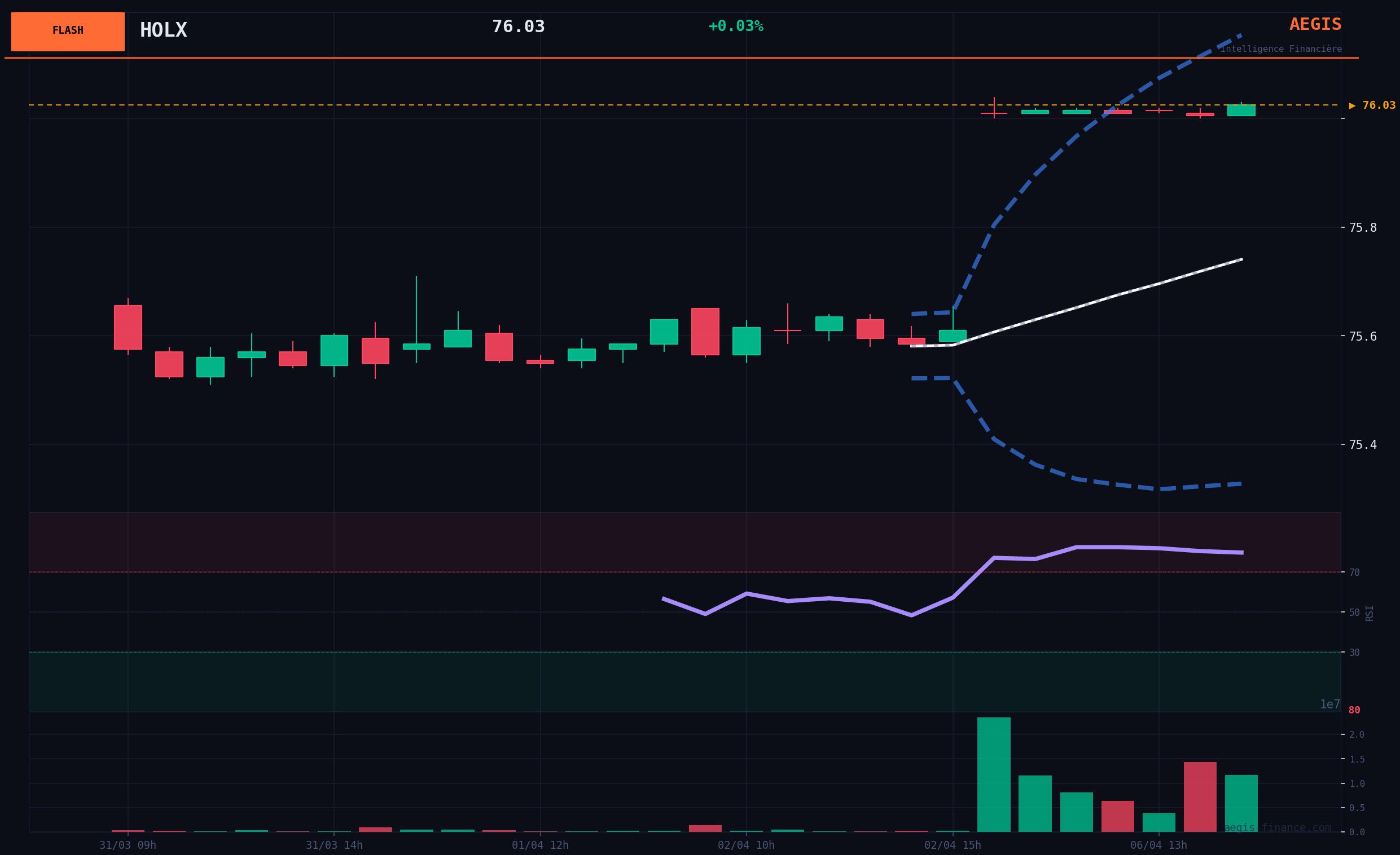 BASE Scenario (Probability 40%): HOLX consolidates around the current level of $76.01, between the $76.07 resistance and the SMA(20) support at $75.47. The high volume reflects a rebalancing of positions following the acquisition, with limited arbitrage by the maximum acquisition price of $79. The RSI remains in overbought territory but without new momentum. Catalysts: maintaining the price in the $75.47-$76.07 range, absence of major macroeconomic news, or stabilization of the VIX.