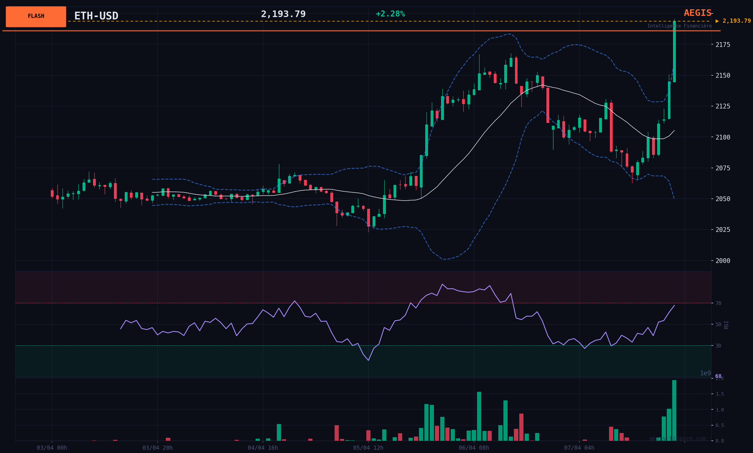 Ethereum (ETH-USD) is currently trading at $2193.79, showing strong intraday momentum of +4.10% with volume at 115% of its monthly average, which demonstrates increased interest. Over the past three days, the asset has recorded notable progress, including a +2.11% increase on April 5 and a strong recovery today. The price is moving above its SMA(20) at $2088.44, confirming short-term BULLISH momentum. However, the long-term structure remains BEARISH, with ETH-USD sitting 26.1% below its SMA(200) at $2969.49 and 55.7% below its 1-year ATH. Key levels to watch include resistance at $2384.47 (1 month) and support at $1930.60 (1 month), while major resistance at $3446.62 (6 months) represents a longer-term target. The relative strength of ETH is in line with BTC over 5 days and outperforms over 20 days (+5.6pts), but underperforms over 3 months (-8.6pts), indicating a recent catch-up.
