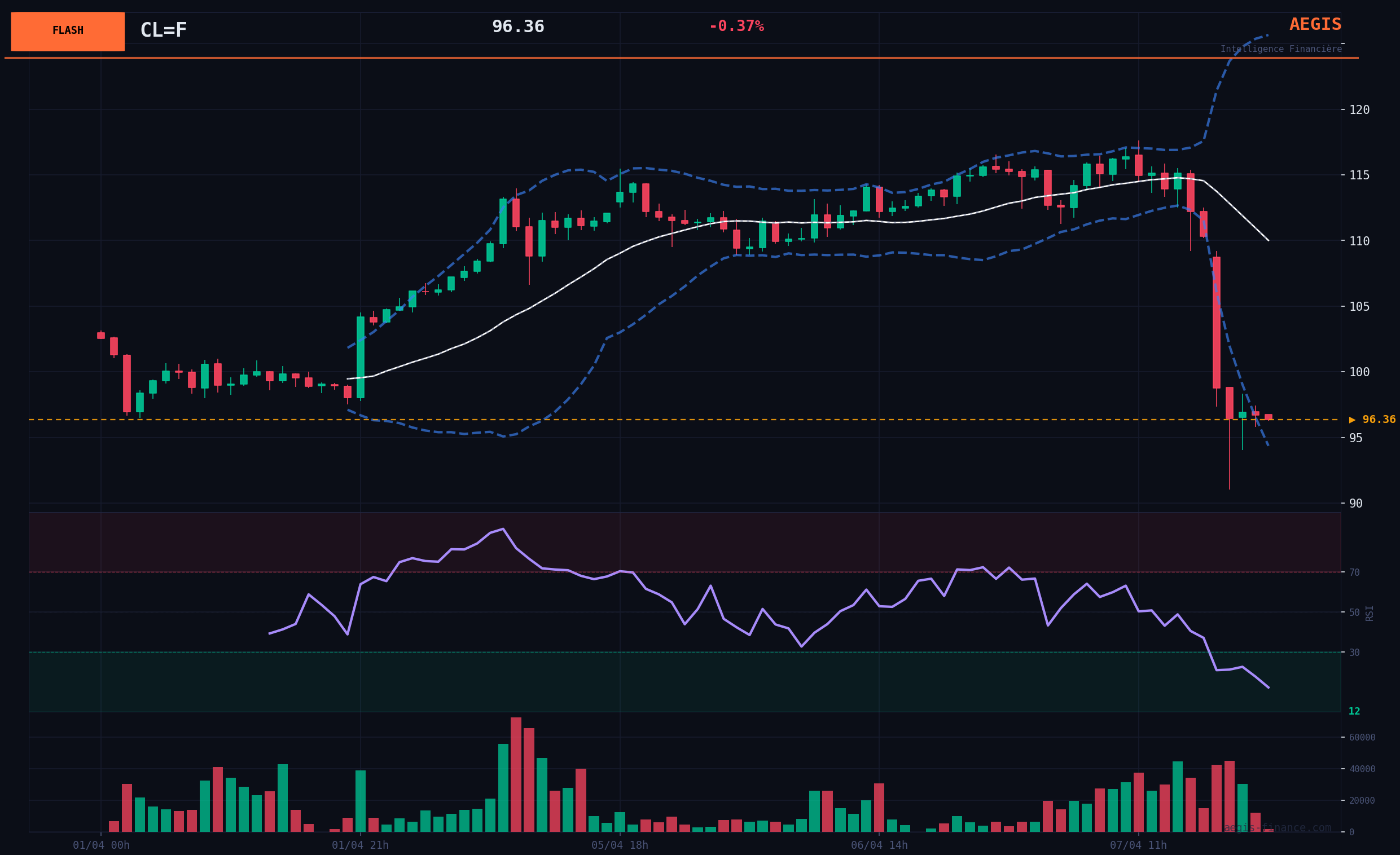 In a market regime in TRANSITION and in the face of a major geopolitical shock, the signal on WTI crude oil (CL=F) becomes BEARISH. The high level of volatility (VIX at 25.78) requires maximum caution and strict risk management. The signal is triggered on a confirmed daily close below $95.00. The main 3-month target is in the area of the 200-day moving average at $66.50, with a first intermediate target at $80.00 to secure some of the gains. The protective stop is placed at $105.00. Recommended sizing: Reduced position (0.5x).
