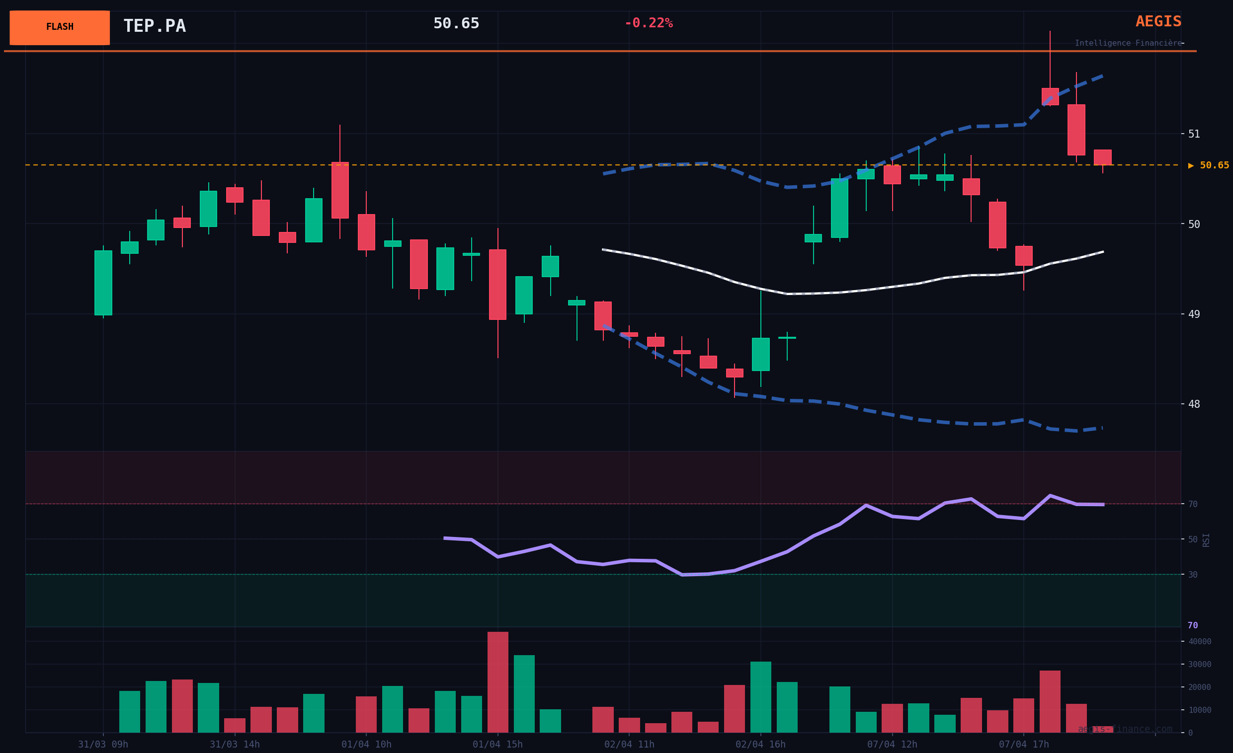 The technical structure remains deeply BEARISH in the long term. The price is trading at €50.65, well below its 200-day moving average (SMA200) located at €63.18, which confirms the negative underlying trend. The main support to watch is at €45.50, a level that has held over the past six months. The RSI (14) at 47 is in NEUTRAL territory, indicating no clear directional momentum in the short term. The most concerning element is the massive and chronic underperformance of the asset relative to its benchmark index, the CAC 40. Over the last 20 sessions, TEP.PA has lost 6.1% while the CAC 40 gained 3.8%, a sign of extreme relative weakness that discourages BULLISH initiatives.