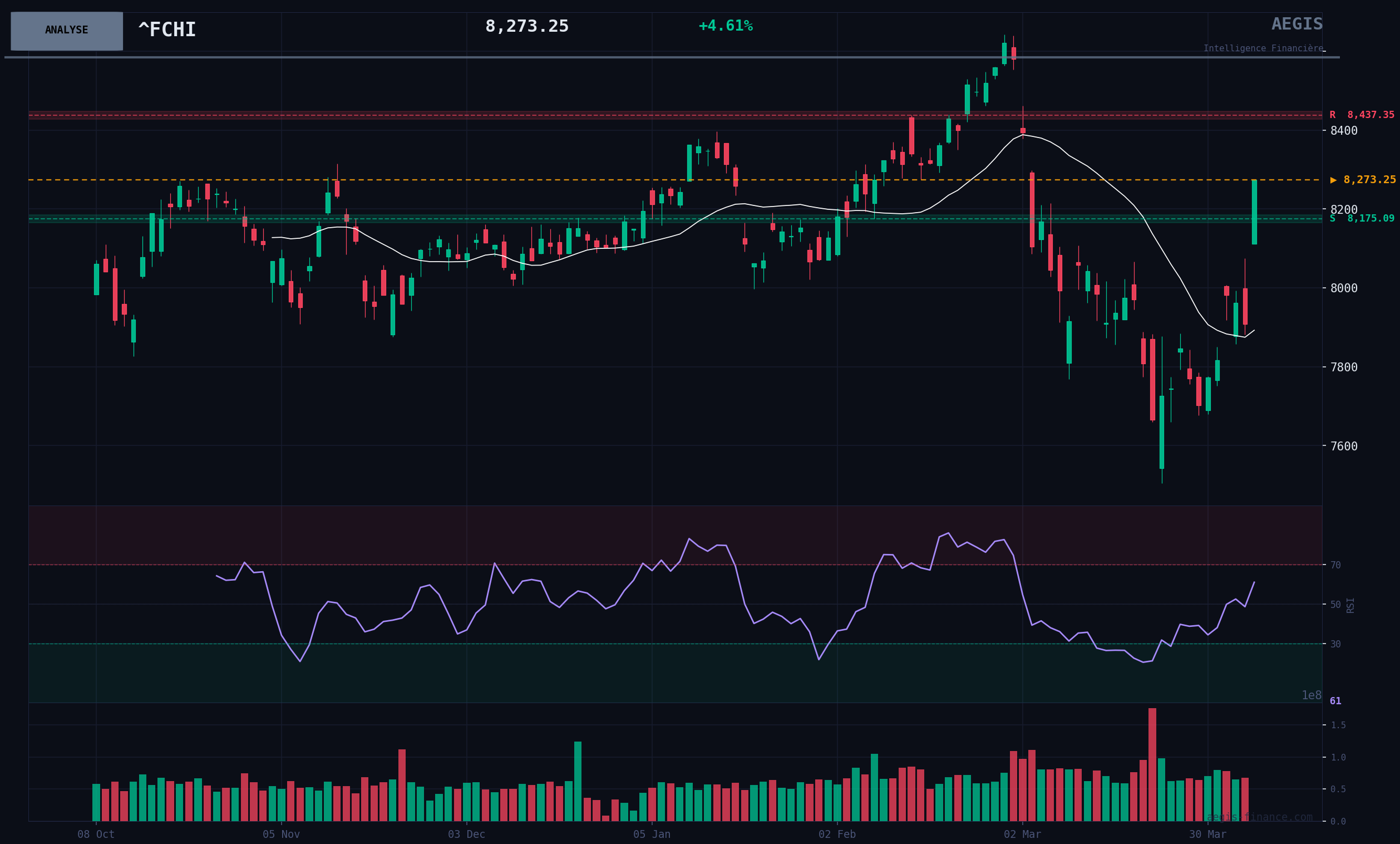 L'indice parisien confirme sa propre dynamique haussière, évoluant fermement au-dessus de ses moyennes mobiles à 50 et 200 jours (8128 et 8006 pts respectivement). La séance du jour est marquée par une forte impulsion (+2.00%) qui valide la sortie d'une phase de consolidation. Le RSI à 61.06 indique une dynamique positive sans être en zone de surachat, laissant un potentiel de hausse à court terme.