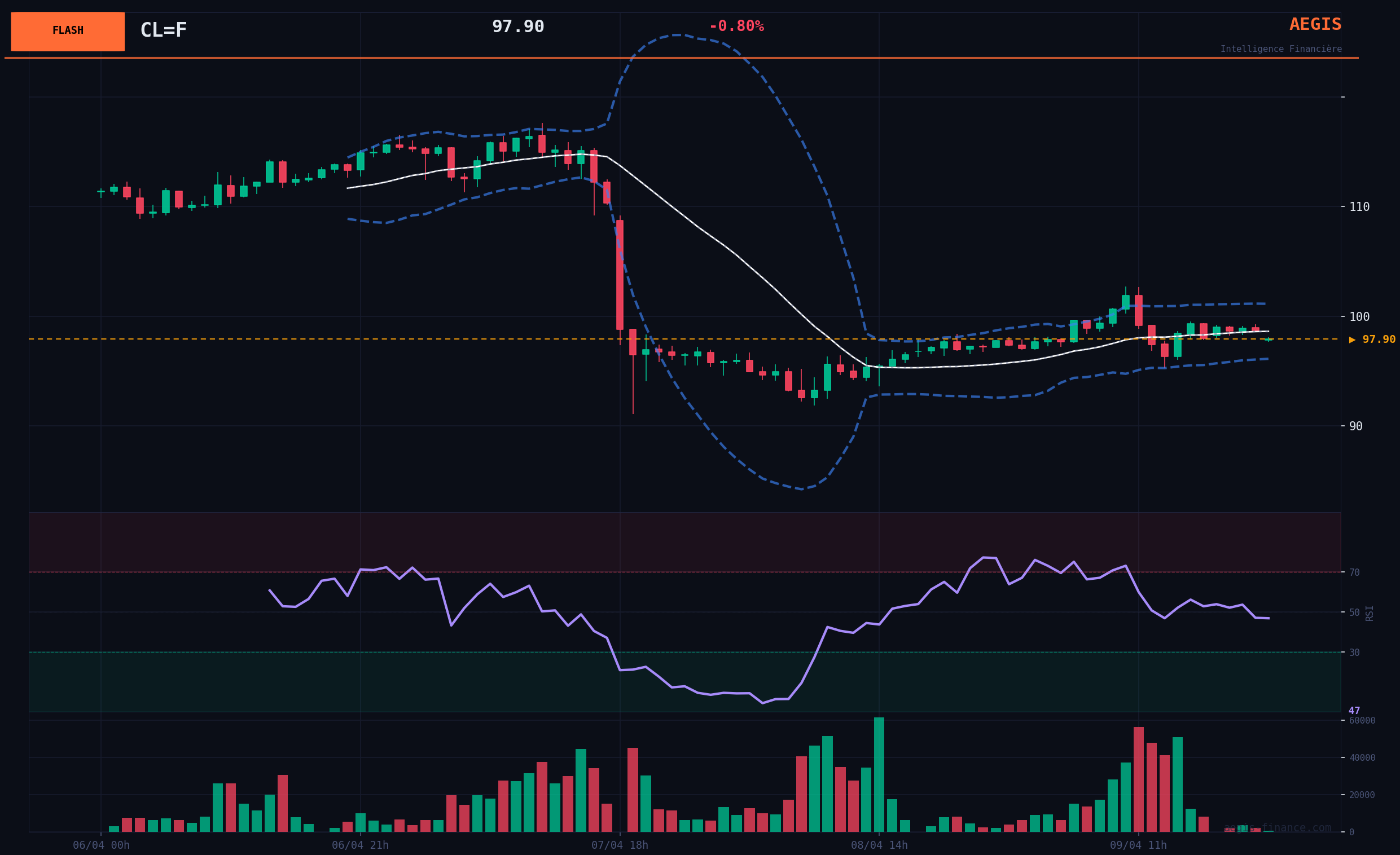 WTI is currently trading at $97.89, just below its 20-day moving average (SMA20) at $98.78. The RSI(14) is NEUTRAL at 49.68. The underlying trend remains BULLISH, with the price well above the SMA200 ($66.83). The dynamics of the last three days have been marked by strong volatility: a drop of -13.18% on April 8 with high volume, followed by a rebound of +1.13% on April 9, also on high volume, signaling a battle between buyers and sellers. The current session shows a slight decrease of -0.35% on very low volume (6% of the monthly average), indicating a consolidation phase after these abrupt movements. The key levels to watch are resistance at $119.48 (1-month and 6-month resistance) and supports at $64.85 (1-month support) and $54.98 (6-month support). The underperformance over 5 days (-12.9% vs GSG -6.1%) contrasts with a notable outperformance over 20 days (+17.3% vs GSG +6.8%) and 3 months (+64.5% vs GSG +31.9%), suggesting an underlying structural strength despite the recent correction.