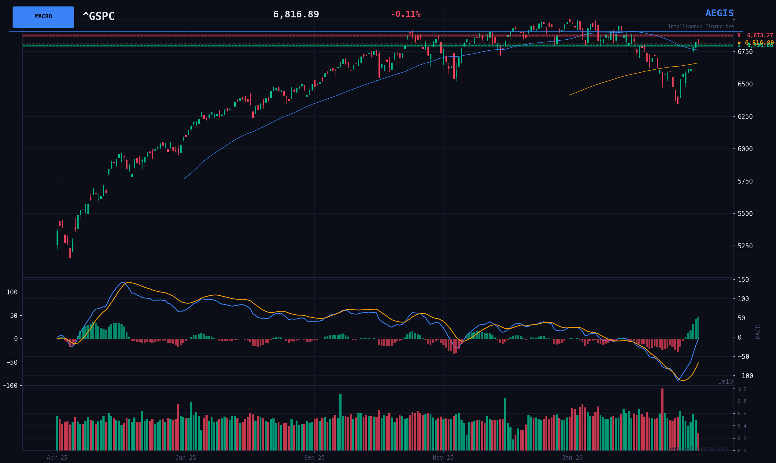 Bullish Scenario (Bull) - 35% probability: A tangible de-escalation in the Middle East acts as the exceptional catalyst required. The resulting drop in oil prices would ease inflationary fears, allowing the "BULL" market regime to fully express itself. The S&P 500 would break through the 6900 pts resistance to target the psychological threshold of 7000 pts.