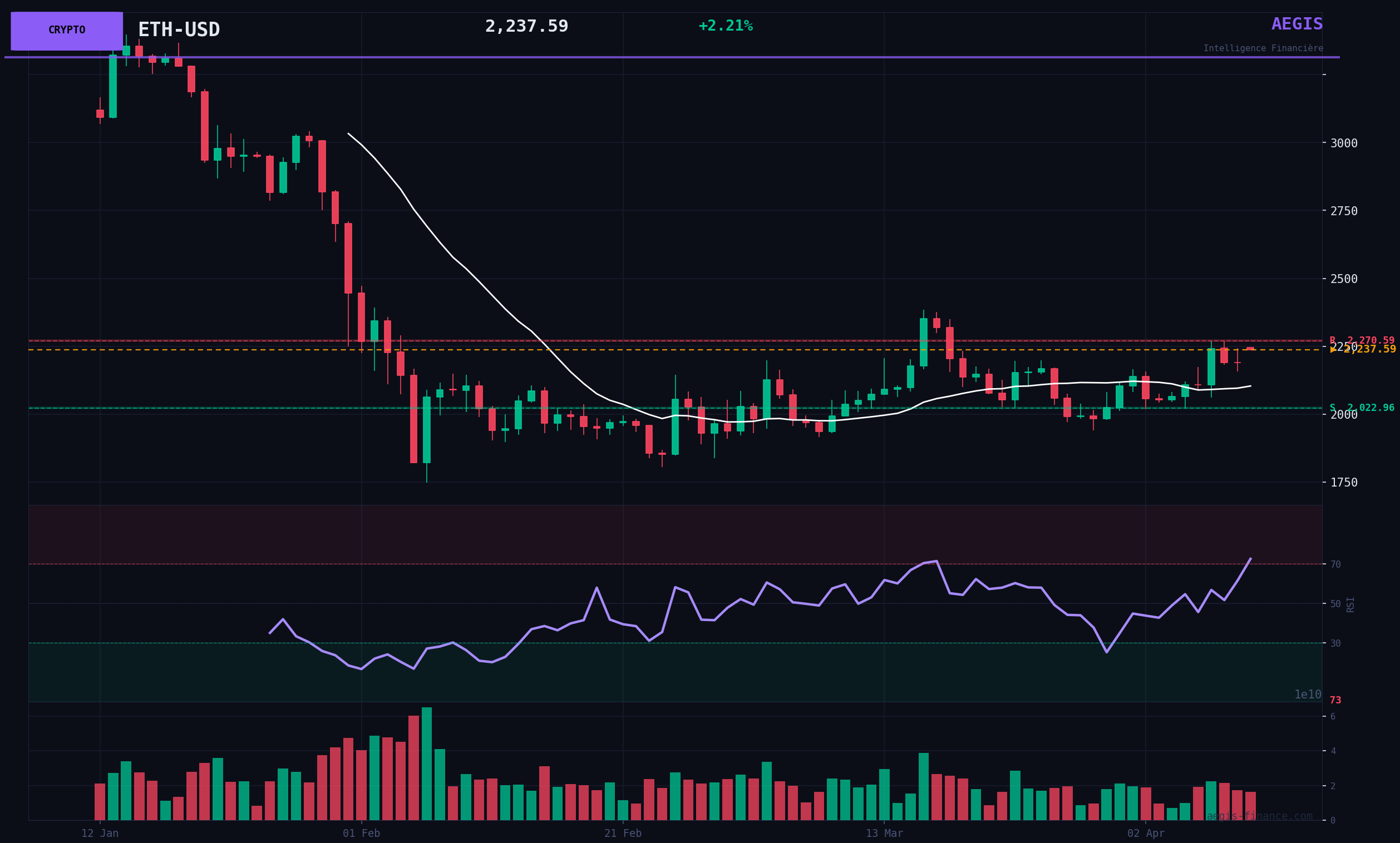 Technically, Ethereum presents a clear dichotomy. In the short term, momentum is positive, with the price holding above its 20-day moving average ($2103). The RSI at 72.59 reflects this recent buying pressure, although it is entering overbought territory. However, the long-term structure remains fundamentally BEARISH. The price is trading 23.8% below its 200-day moving average ($2937), which constitutes a major structural resistance. Recent transaction volumes, at 98% of the monthly average, do not indicate strong conviction or capitulation, reinforcing the idea of a consolidation phase. Key levels to watch are resistance at $2384 and support at $1939.