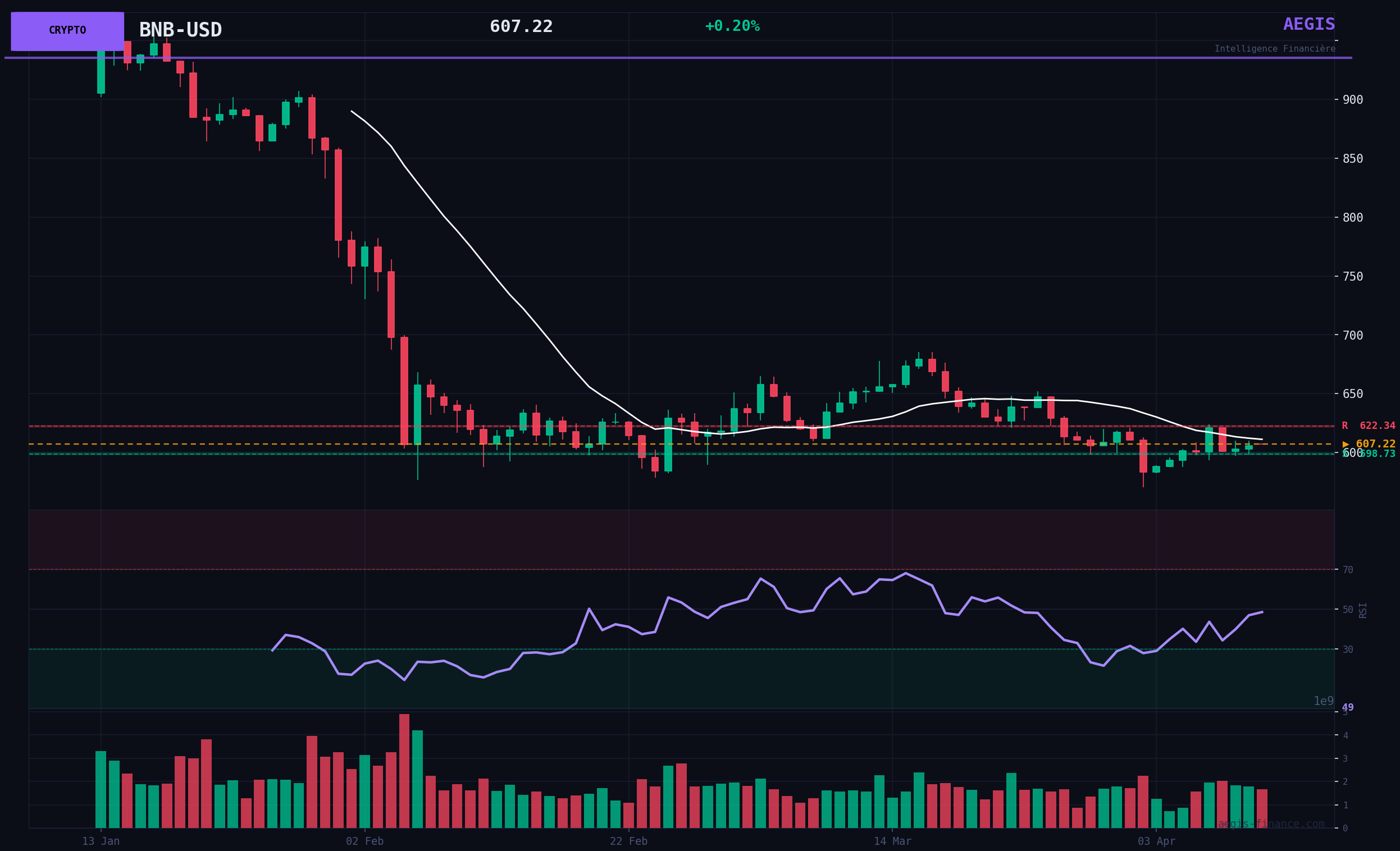 Technically, BNB presents a BEARISH underlying structure. The price of 607.22$ is trading below its 20-day moving average (611.18$) which acts as immediate resistance, and remains very far from its 200-day moving average (846.56$), confirming a negative long-term trend. The RSI at 48.50 is in neutral territory, showing no strong momentum in either direction. Recent volumes, at 103% of the average, are standard and do not signal any particular institutional pressure. The key support level to watch is at 570.68$. A break of this level would open the way to a new downward leg, while a hold could allow for a consolidation phase.