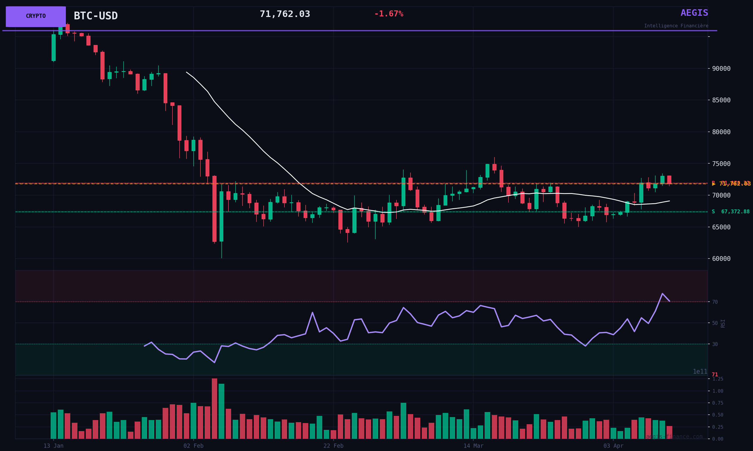 Bitcoin is currently trading at 71762.03$. The RSI(14) is at 70.66, suggesting an overbought zone that could precede a consolidation. The price remains above its 20-day moving average (SMA20) at 69083.77$, indicating short-term BULLISH momentum. However, Bitcoin is trading significantly below its 200-day moving average (SMA200) at 88078.65$, with a difference of -18.5%, which characterizes a long-term BEARISH market structure. Key support levels are identified at 64971.71$ (1-month support) and 60074.20$ (6-month support). Major resistances are located at 75988.40$ (1-month resistance) and 97860.60$ (6-month resistance). Over the past three days, Bitcoin has recorded gains of 0.91% and 1.68% on April 9 and 10, with normal volumes. The current session shows a pullback of -1.77% with a volume at 76% of its monthly average, which indicates profit-taking without strong institutional selling pressure.