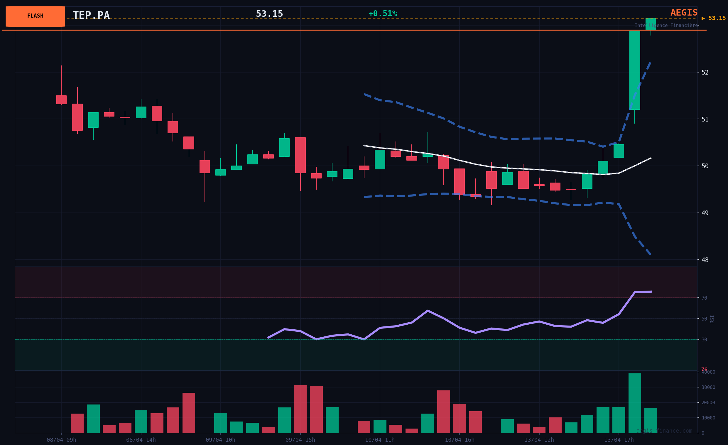 In a BULLISH regime (SPY > MA50 > MA200) but with a CRITICAL RAS (85/100), this BULLISH signal on TEP.PA relies on short-term technical dynamics and a positive analyst consensus. The macro risk remains HIGH due to geopolitical and energy tensions. The signal is triggered on breaking the resistance at €53.50. TP1 at €60.38 for partial securing, TP2 at €68.04 as final target. Recommended sizing: Reduced position (0.5x) due to the very uncertain macro context.