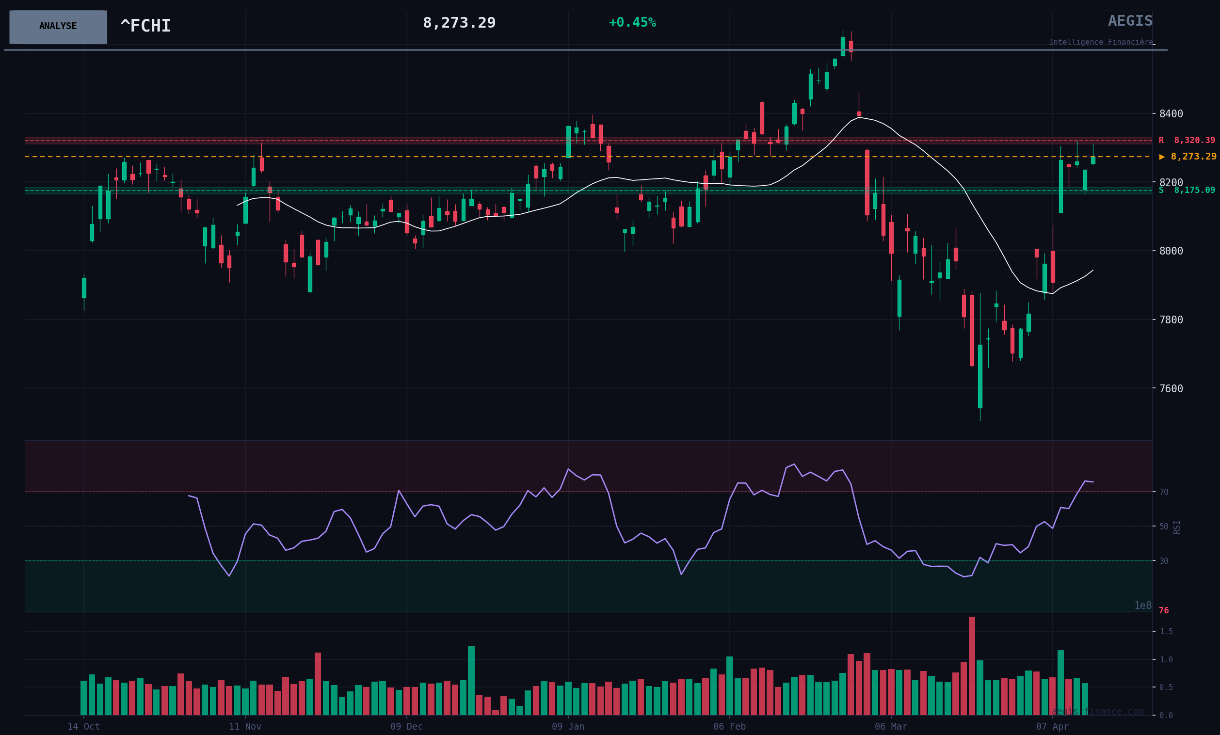 The CAC 40 remains above its 50-day and 200-day moving averages, confirming a long-term BULLISH trend. The index has closed the last three sessions in positive territory, with a positive intraday variation. The RSI(14) at 75.69 indicates an overbought situation, which could lead to a short-term consolidation. The current volume is low, at 0% of its monthly average, suggesting a lack of conviction from buyers.