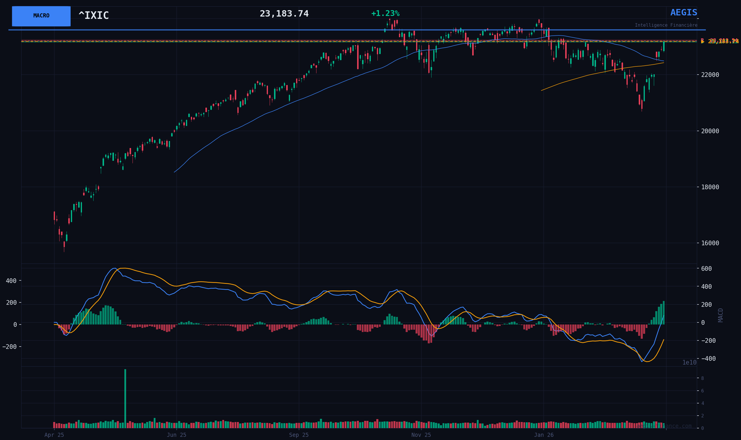 Dans un régime BULL (SPY > MA50 > MA200) mais avec un RAS CRITIQUE (78/100), ce signal HAUSSIER sur ^IXIC repose sur la dynamique positive court terme et la possibilité d'une désescalade des tensions géopolitiques. Le risque macro reste élevé - ratio R/R de 2.6:1 requis. Le signal se déclenche sur rupture de la résistance court terme à 23187.96 points. TP1 : 23600 points. TP2 : 24019.99 points. Sizing recommandé : Position réduite (0.5x).