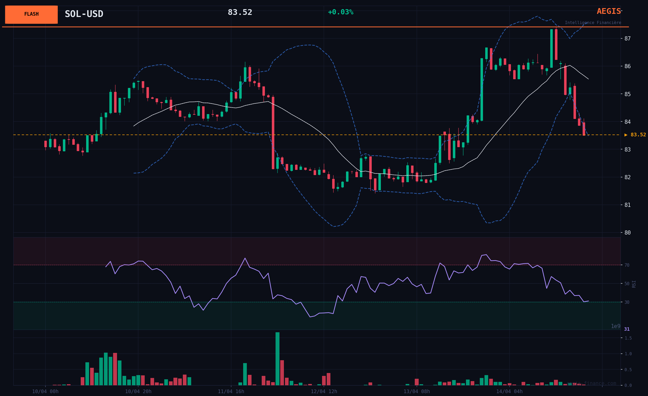 The current price of Solana (SOL-USD) is established at 83.52$. The asset is currently evolving below its 200-day moving average (SMA200), which is at 129.43$, a difference of -35.5%, confirming a long-term BEARISH structure. The SMA20 is at 82.74$, with the price maintaining just above it. Over the last three days, SOL recorded a decrease of -4.02% on April 12, followed by an increase of +6.28% on April 13 with high volume (4.97 billion). The current day (April 14) shows an intraday variation of -3.60% with a volume of 6.29 billion, representing 130% of its monthly average. This high volume on a decrease indicates significant selling pressure in the short term. The RSI(14) is at 50.67, signaling a NEUTRAL dynamic. Key support levels are identified at 76.82$ (1-month support) and 68.69$ (6-month support), while resistances are found at 97.42$ (1-month resistance) and 148.22$ (6-month resistance). In terms of relative strength, SOL-USD underperforms Bitcoin (BTC-USD) over all analyzed periods (5 days, 20 days, 3 months), which is a warning signal on its structural weakness.