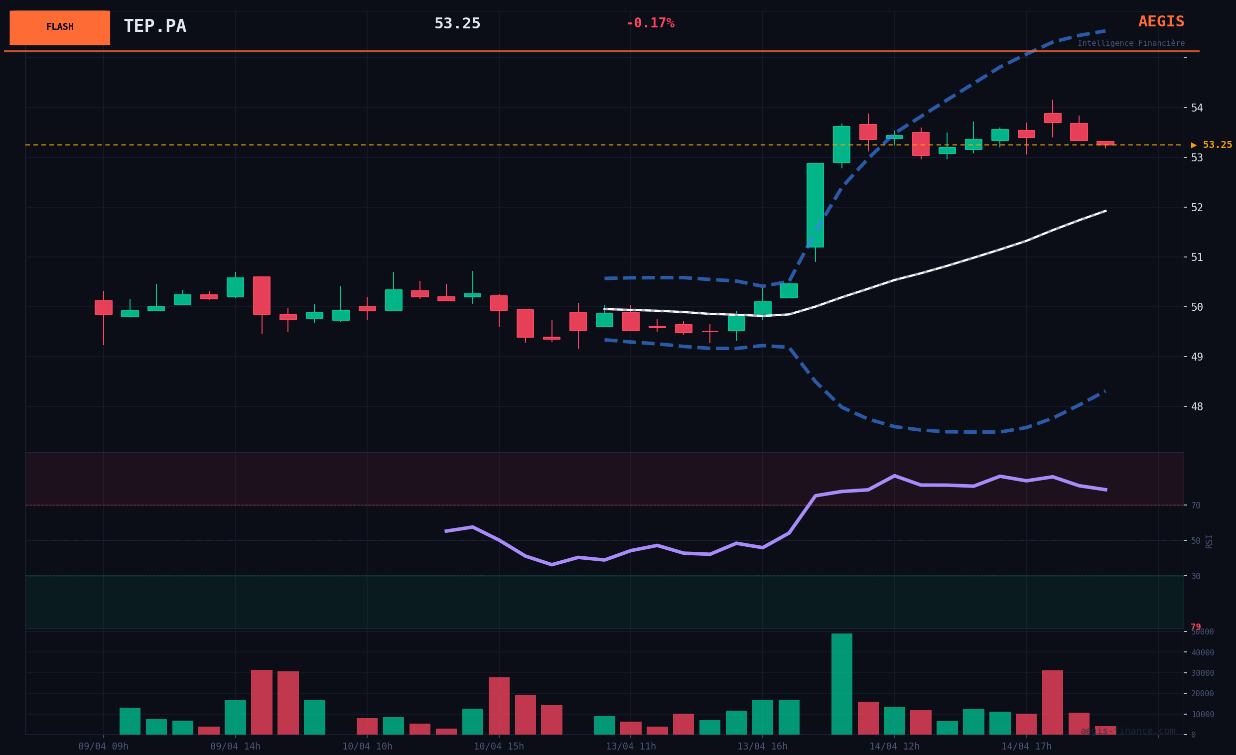In a BULL regime (SPY > MA50 > MA200), this BULLISH signal on TEP.PA is based on an attractive valuation and potential for a technical rebound. Macro risk remains HIGH (RAS 71/100) – an R/R ratio of 3.625:1 is required. The signal is triggered on a daily close above 53.50€. The targets are a TP1 at 60.75€ for partial securing, and a TP2 at 68.00€ as a final 3-month target. The stop-loss is set at 49.50€. Recommended sizing: Reduced position (0.5x).