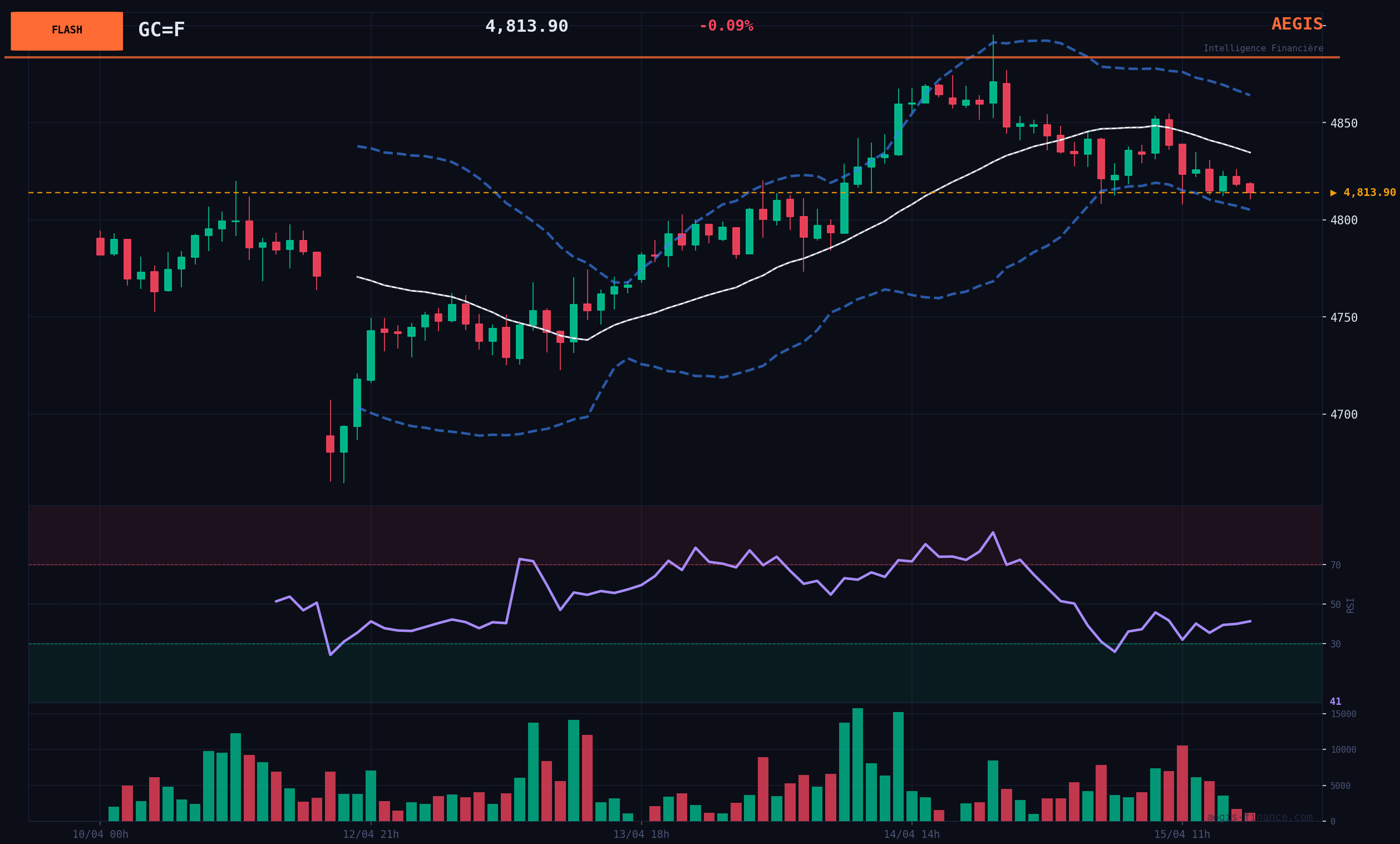 The current price of gold is $4813.90. After two days of positive closes, the current session is recording a slight intraday decline of -1.00%, but with exceptionally high volume (1021% of the monthly average). This massive volume, despite the slight intraday decline, suggests strong rebalancing or institutional positioning activity, rather than capitulation. The RSI(14) at 63.23 indicates solid BULLISH momentum, without being in extreme overbought territory. Technically, gold is trading above its key moving averages: the price is above the SMA(20) at $4644.44 and the SMA(200) at $4172.71, confirming a well-established BULLISH trend across all time scales. Major support levels are at $4100.80 (1 month) and $3913.70 (6 months), while key resistances are at $5229.70 (1 month) and $5586.20 (6 months). The price's ability to stay above the SMA20 is crucial for the continuation of the trend.