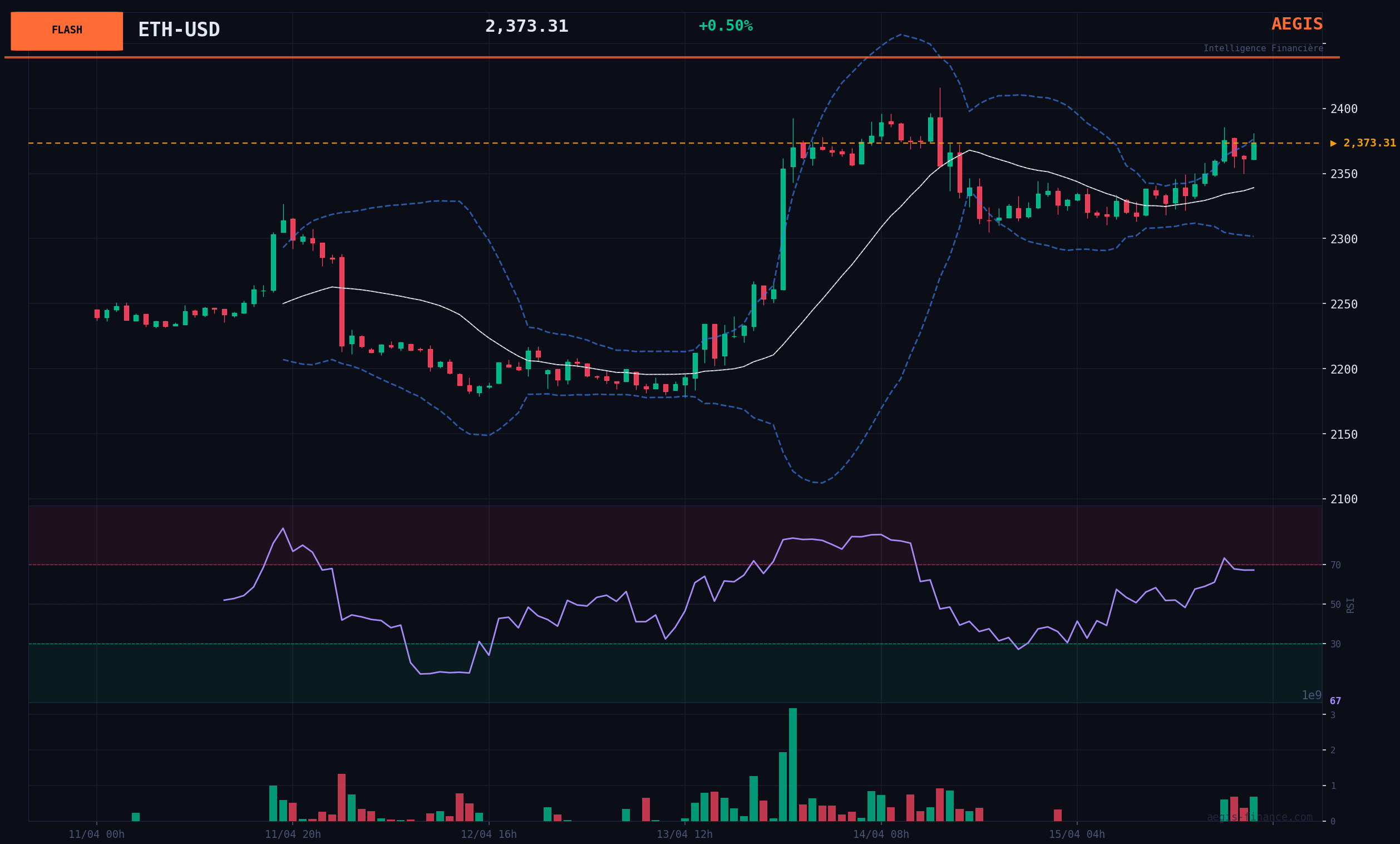 Technically, Ethereum is evolving in a complex configuration. At $2373.31, the price is -18% below its 200-day moving average (SMA200) at $2893.69, which confirms a BEARISH underlying structure. Nevertheless, the short-term dynamic is constructive: the price has rebounded above its SMA20 ($2151.86) and the RSI (14) at 64.77 indicates sustained buying momentum. The sequence of the last three days shows a strong BULLISH impulse (+8.14%) followed by consolidation, indicating an absorption of selling pressure. Volumes, at 101% of the monthly average, confirm standard participation without excess. Key levels to watch are resistance at $2415.53 and major support at $1939.53.
