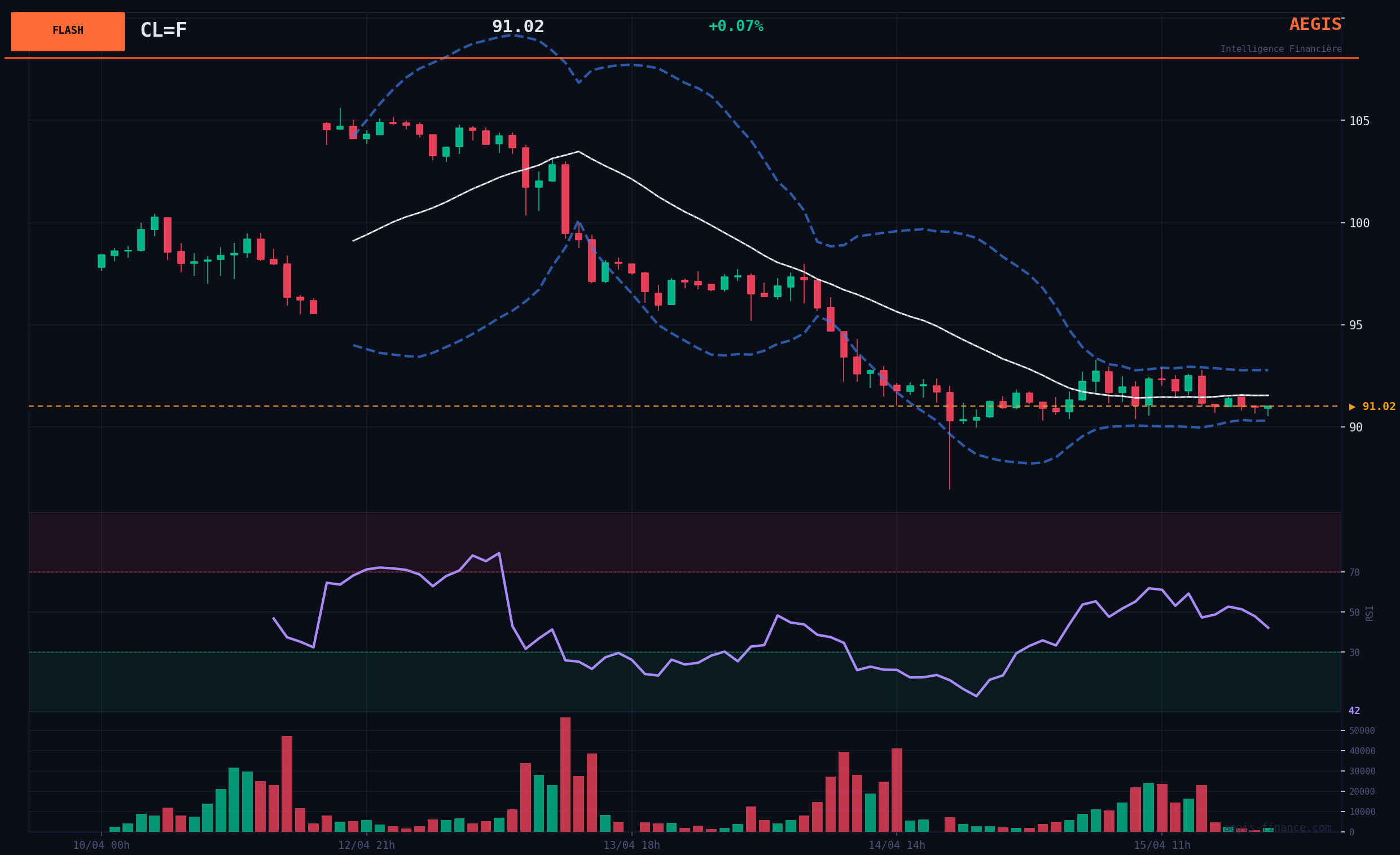 After reaching highs near $102, WTI underwent a violent correction of more than 10% in two days, bringing it back to the current level of $91.02. The price thus broke its 20-day moving average ($98.36), which now acts as the first resistance. However, the underlying trend remains BULLISH, with the price moving well above its 200-day moving average ($67.25). The RSI(14) momentum indicator is at 50.56, in full NEUTRAL territory, confirming the absence of a clear direction at this stage. Immediate support is on the recent low around $89-91, before the key zone of $73.28.