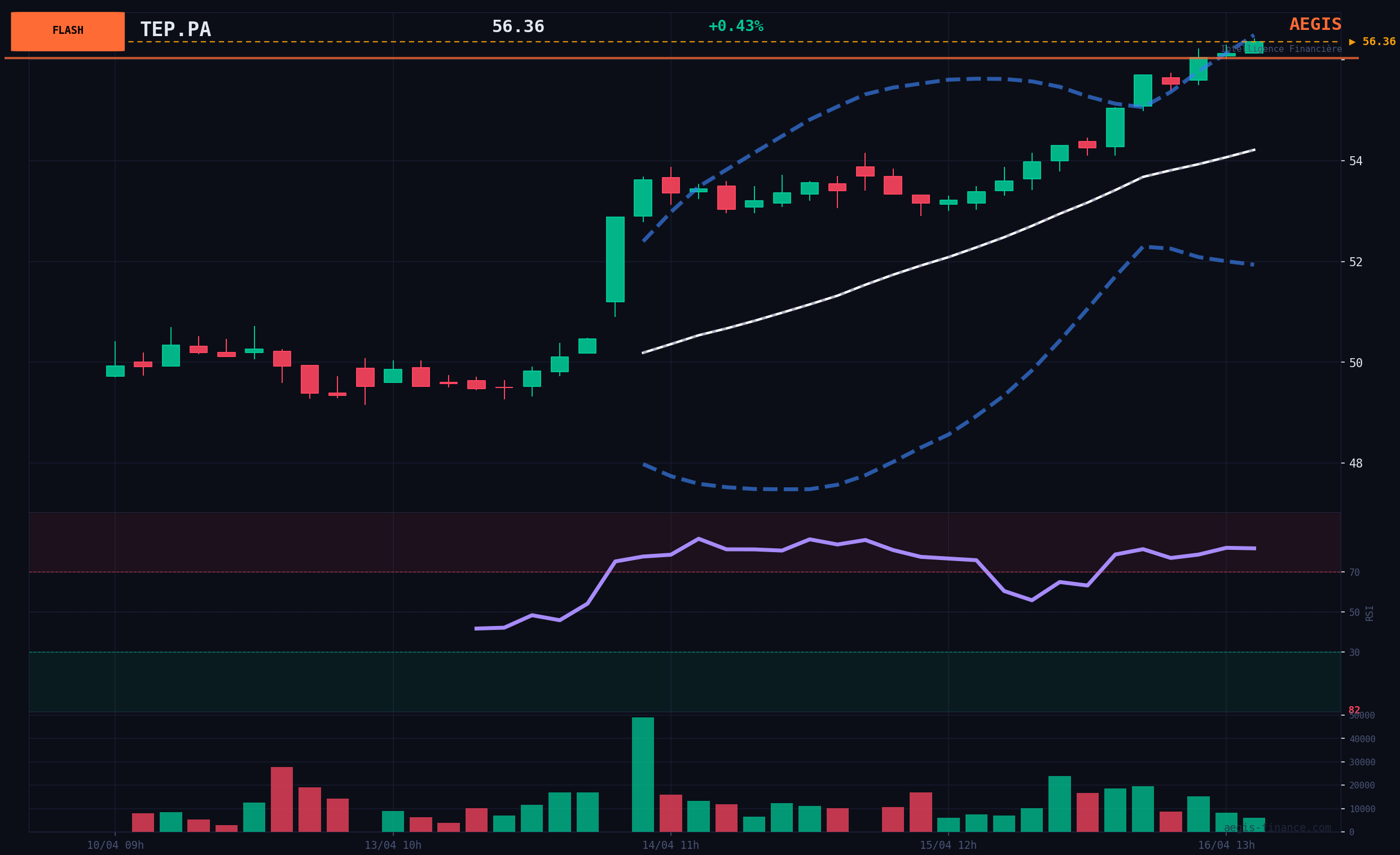 The stock recorded a strong BULLISH acceleration of +3.83% in the session, confirming the positive momentum of recent days (+13.7% over 5 days), significantly outperforming the CAC 40 index. However, this surge occurred on still low volumes (13% of the monthly average), which calls for caution. The RSI (14) indicator is in extreme overbought territory at 82.83, signaling a high risk of consolidation or reversal in the short term. Structurally, the price has crossed its 20-day moving average (50.06€) but remains capped by the 200-day moving average (62.26€), which constitutes the long-term resistance to beat to validate a fundamental trend reversal.