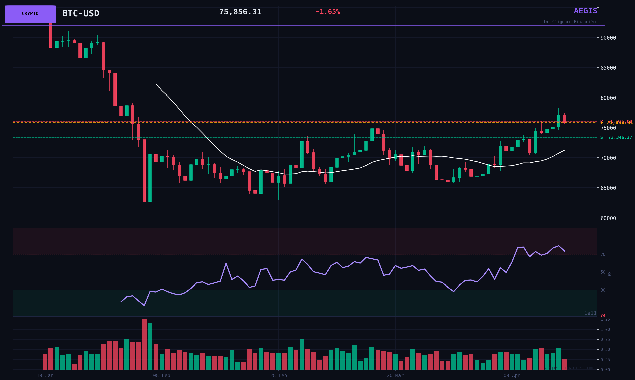 Technically, Bitcoin is evolving in a complex configuration. After a strong push in recent days, the price is undergoing an intraday pullback of -1.65% but with moderate volumes (73% of the average), which for now rules out a capitulation scenario. The main structural obstacle remains the 200-day moving average, located at $86 785, below which the price is evolving, confirming an underlying trend that is struggling to become purely BULLISH again. The RSI at 73.54 flirts with the overbought zone, which may limit the upside potential in the short term without a consolidation phase. Key levels to watch are resistance at $78 320 and major support from the last month at $64 971.