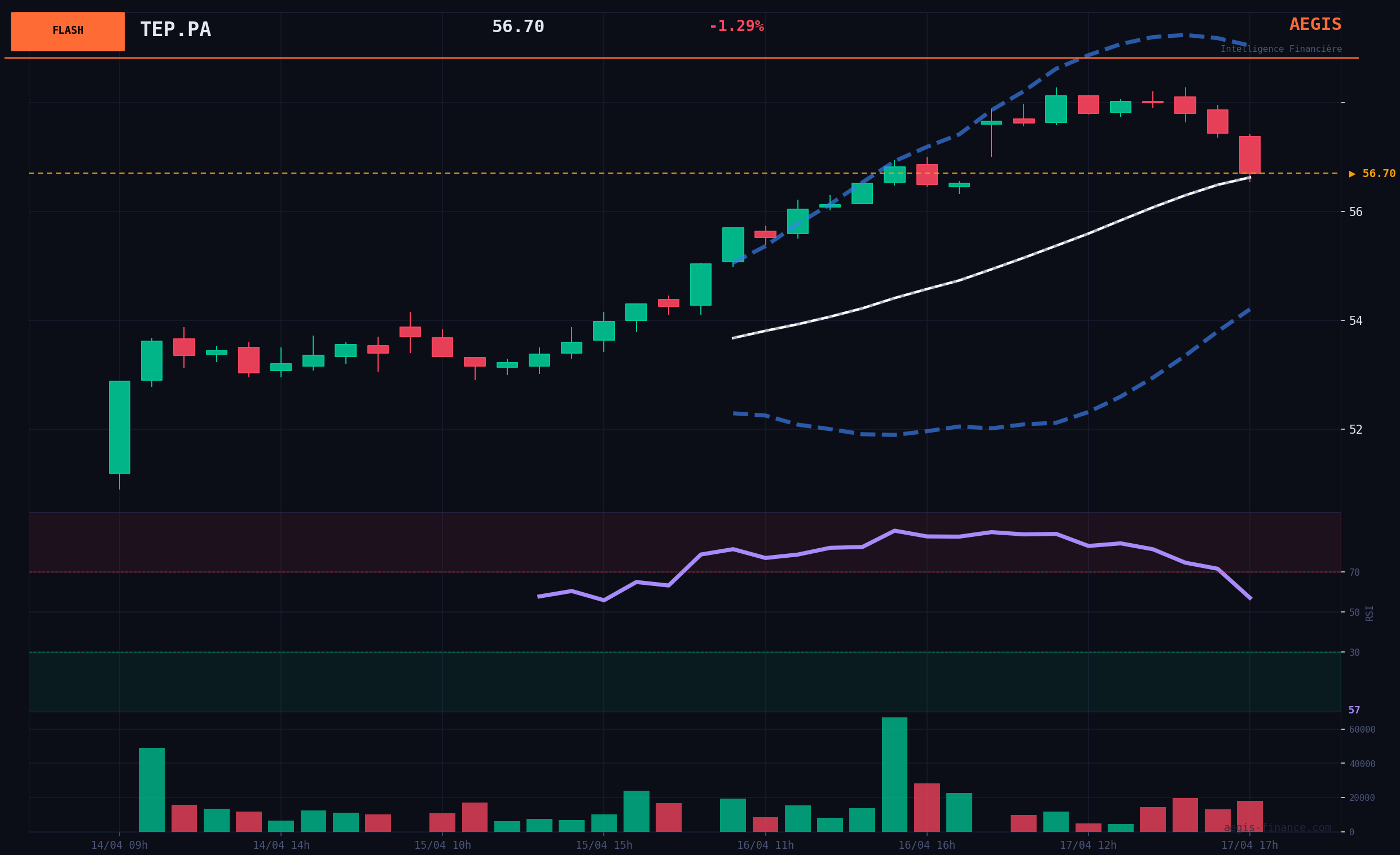 The stock has experienced a strong BULLISH acceleration in recent sessions, outperforming the CAC 40 index over 5 days. This momentum has pushed the RSI (14) indicator above 80, an extreme overbought level that calls for caution. The current price of €56.82 is encountering a critical resistance zone: the 200-day moving average, located at €62.13. Historically, this moving average acts as a major resistance or support. A failure below this level would confirm that the current movement is only a technical rebound within an underlying trend that remains to be confirmed, especially since the stock still significantly underperforms the index over a 3-month horizon.