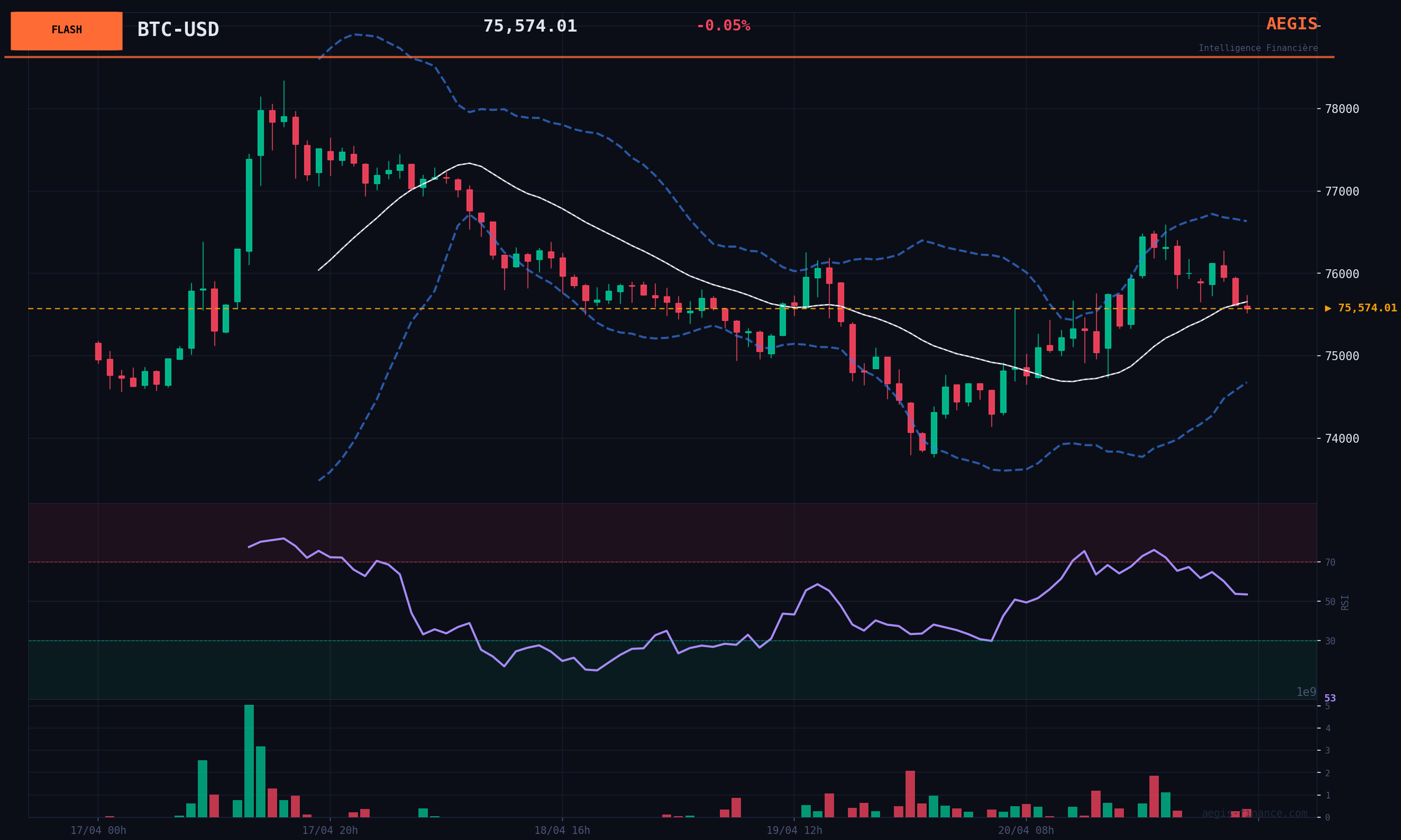 - BEARISH Scenario (Probability: 65%): A further escalation of geopolitical tensions or a confirmation of a global economic slowdown would lead to a flight to quality, penalizing Bitcoin. A break of the 73 850 $ support would open the path towards support levels at 64 971 $ then 60 074 $.