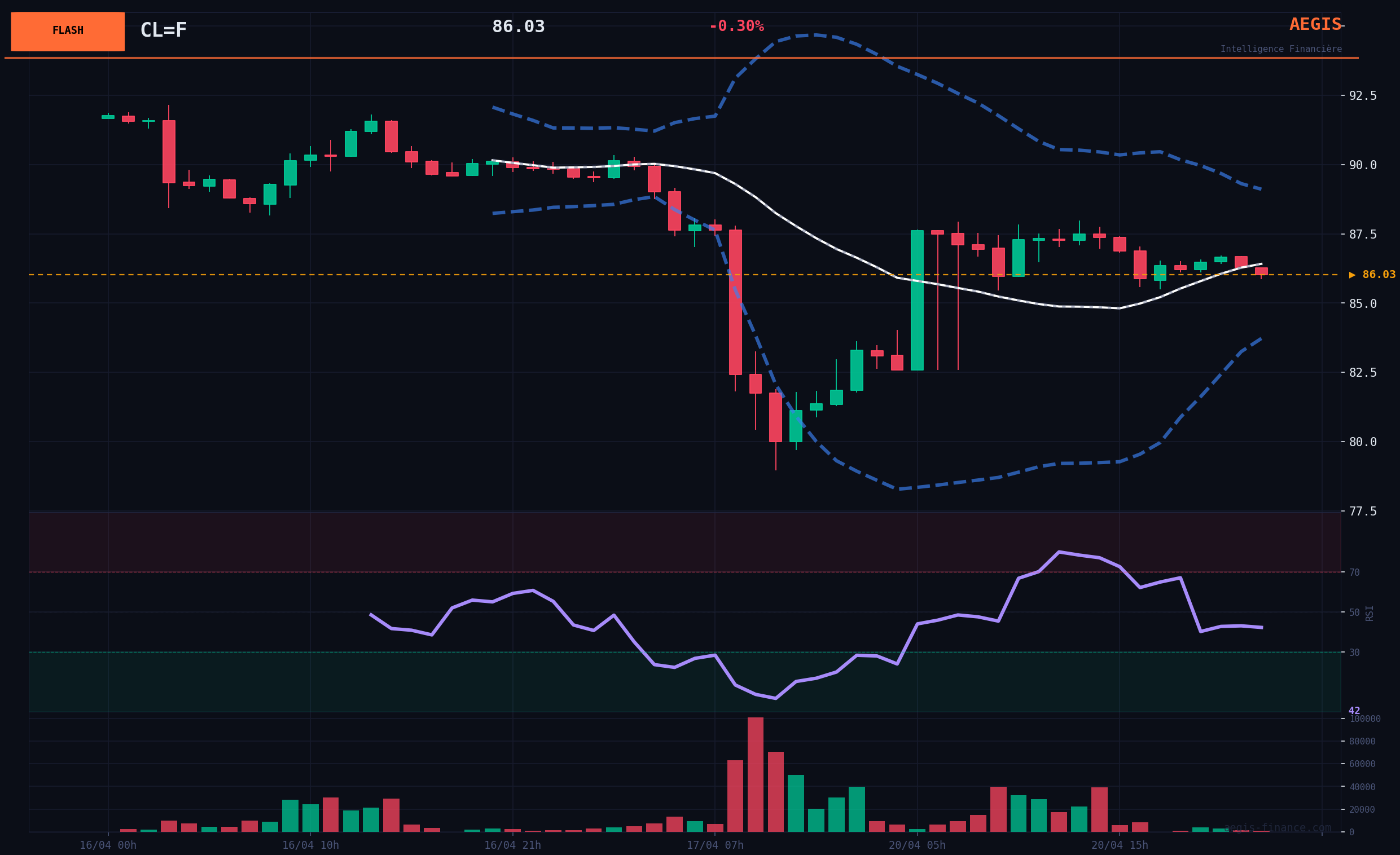 L'analyse des flux de marché sur le pétrole WTI présente un tableau contrasté. D'une part, la structure de la courbe des futures reste en "backwardation" marquée (+41.9% sur 3 mois), signalant une tension persistante sur l'offre physique et un soutien structurel aux prix. De plus, la faiblesse relative du Dollar Index (DXY à 98.11) est un facteur traditionnellement porteur pour les matières premières. Cependant, ces éléments sont actuellement éclipsés par la dynamique des prix. Le volume moyen sur 5 jours est en net recul (-57% par rapport à la moyenne sur 30 jours), ce qui suggère que la récente chute est davantage une réaction épidermique à une nouvelle géopolitique qu'une vague de fond institutionnelle. Le biais agrégé des flux est donc MIXTE, avec des fondamentaux de marché physique (backwardation) en opposition à un sentiment de court terme devenu négatif.