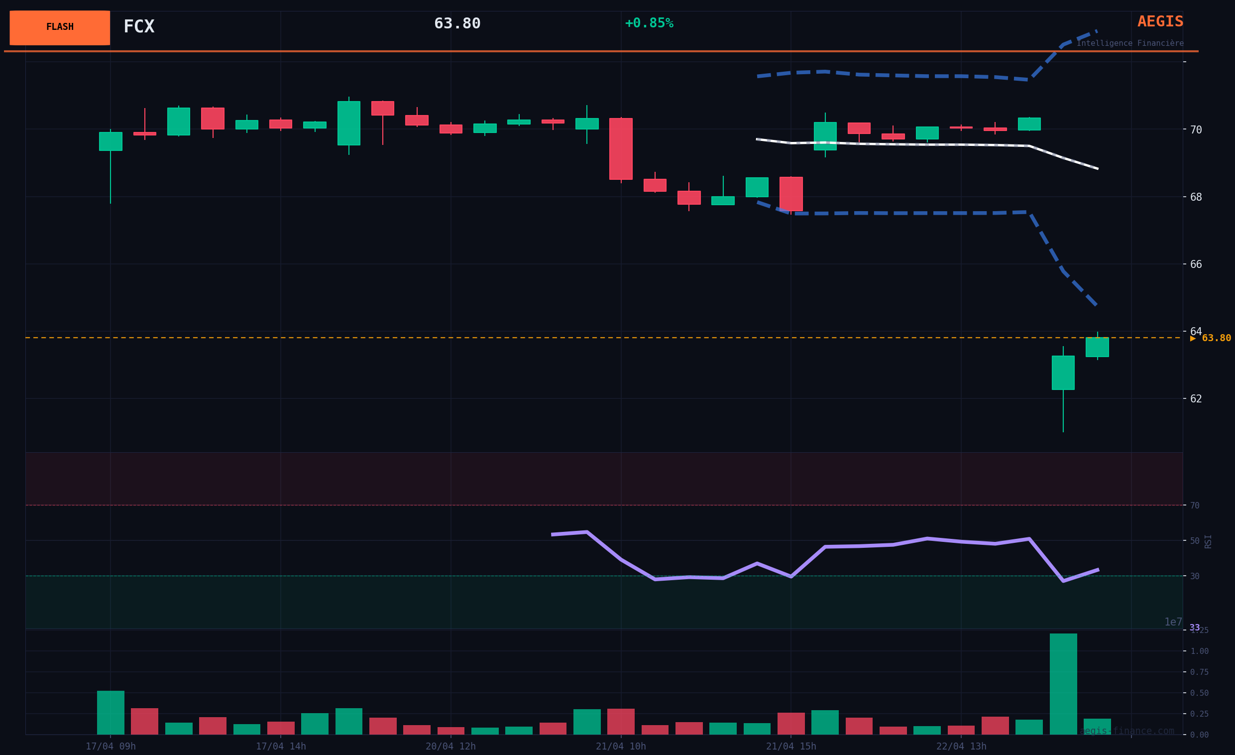 In a BULL market regime, this BEARISH signal on FCX is triggered by a specific fundamental deterioration (production reduction), which overrides the favorable macroeconomic context. The critical geopolitical risk (RAS 77/100) reinforces this defensive bias. Options market flows, with a Put/Call Ratio of 3.85, confirm a massively protective or BEARISH positioning by operators. The signal is triggered upon a daily close confirming the break below the SMA20 (currently at 64.15$). The first target (TP1) is set at 55.00$, with a final target (TP2) at 50.50$. Recommended sizing: Reduced position (0.5x) due to the very high ambient macro risk.