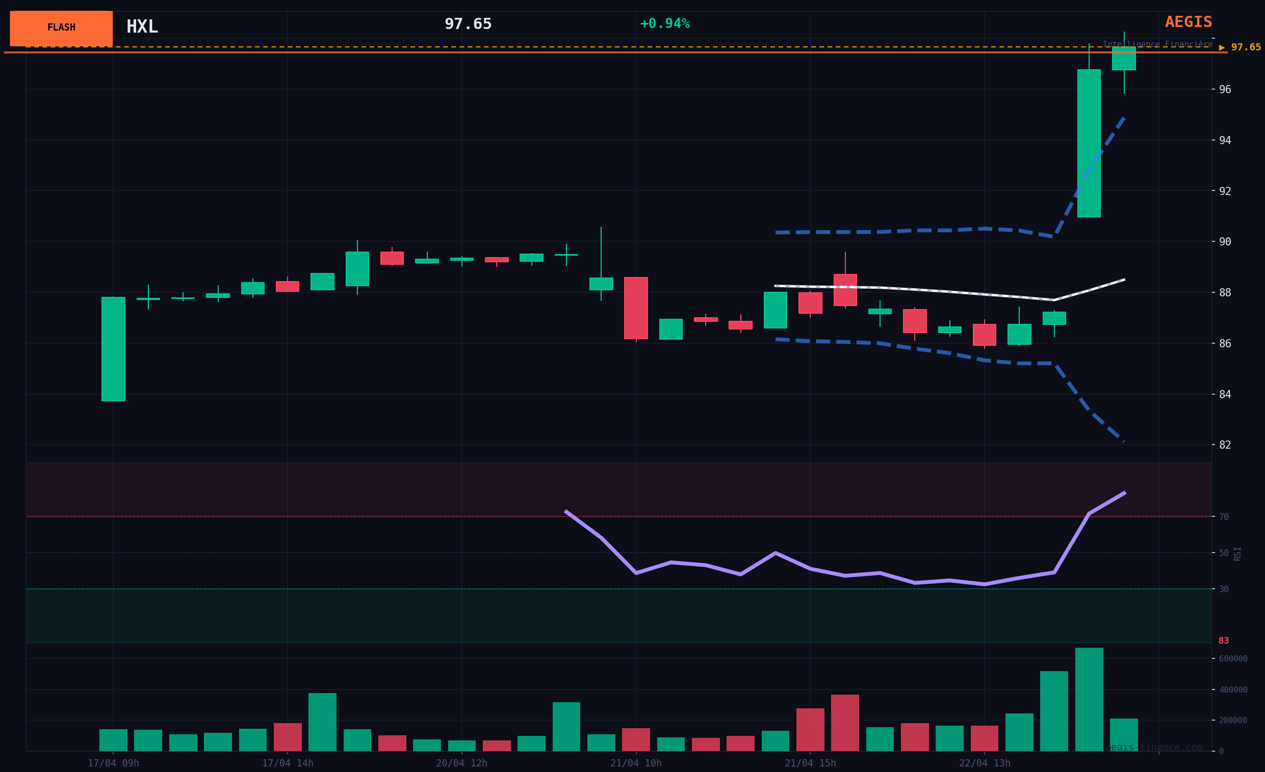HXL stock exhibits powerful momentum dynamics, evidenced by today's BULLISH breakout on significant volumes. The price is now encountering major resistance at $98.26, which corresponds to the 52-week high. The Relative Strength Index (RSI) at 82.13 signals an extreme overbought condition, which would normally suggest short-term consolidation or a pullback. However, in the context of such a strong fundamental catalyst, a high RSI can persist while the price continues to ascend. HXL's outperformance relative to the S&P 500 over the last 3 months (+12.9 points) confirms strong investor interest in the stock.