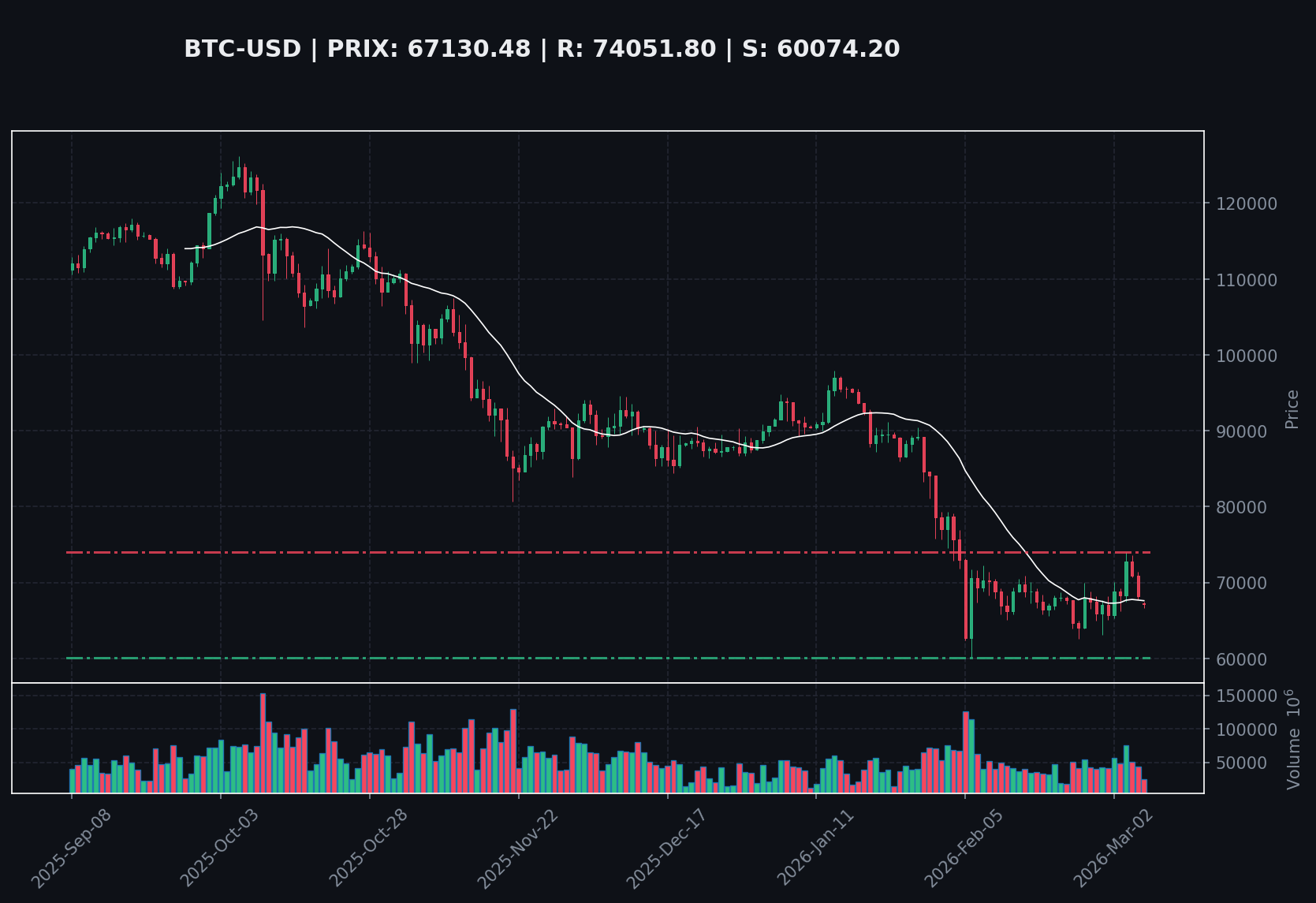 Le verdict est NEUTRE. L'impulsion haussière a été clairement rompue par une distribution à volume élevé. L'actif est entré dans une phase de consolidation latérale, signalant un équilibre temporaire entre acheteurs et vendeurs. Bien que la pression vendeuse se soit calmée, l'absence de rebond significatif au-dessus de la SMA20 empêche tout diagnostic haussier à court terme. Le risque est actuellement symétrique, avec une probabilité de re-tester le support des 60 074 $ si la consolidation actuelle venait à céder par le bas.