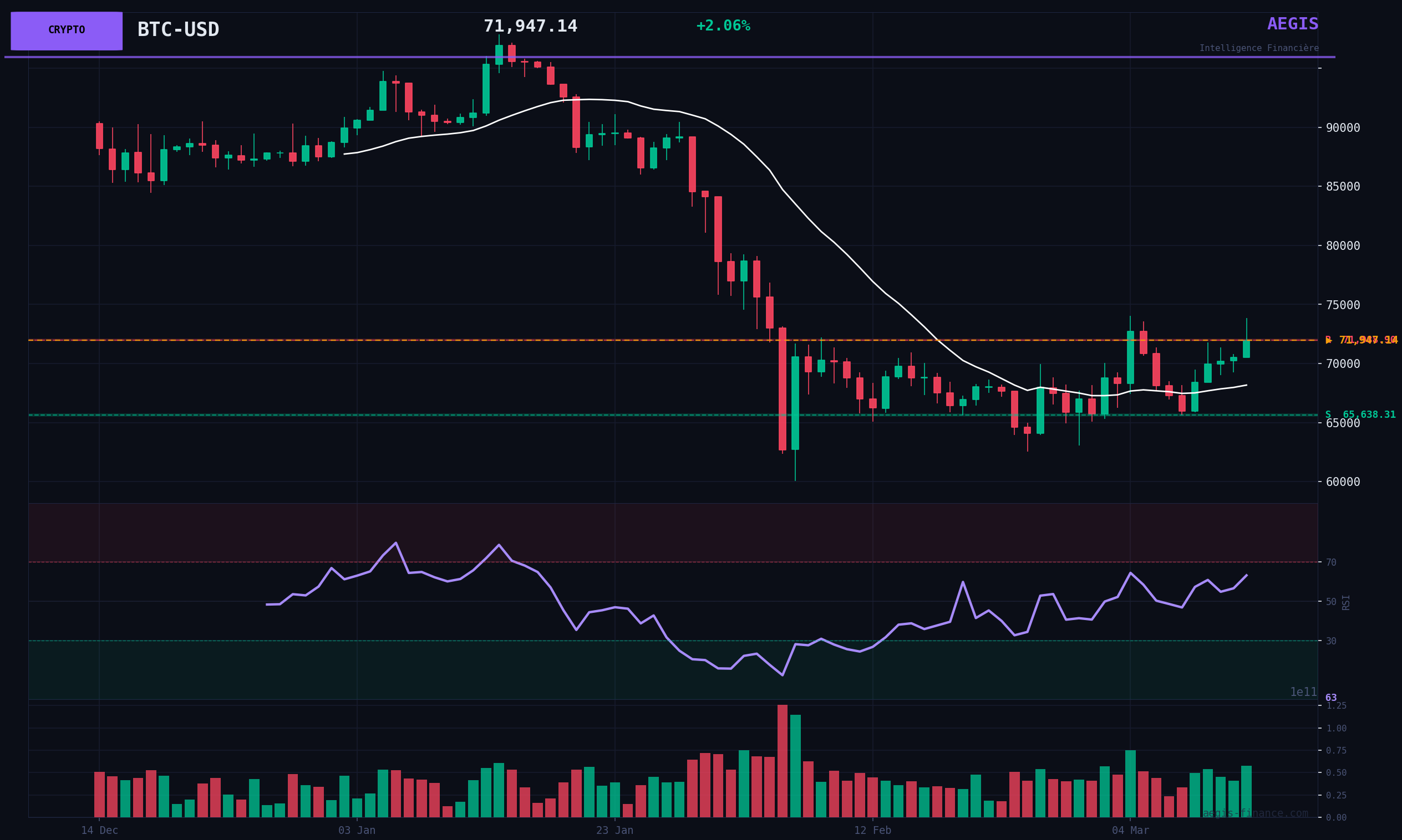 Technically, Bitcoin is currently trading at $71940.88, above its short-term SMA(20) at $68167.72. The RSI(14) at 63.16 indicates BULLISH momentum, but without excess. The resistance at $74051.80 represents a short-term target, while the support at $62553.19 offers a level of protection. The day's volume, above average, confirms interest in Bitcoin.