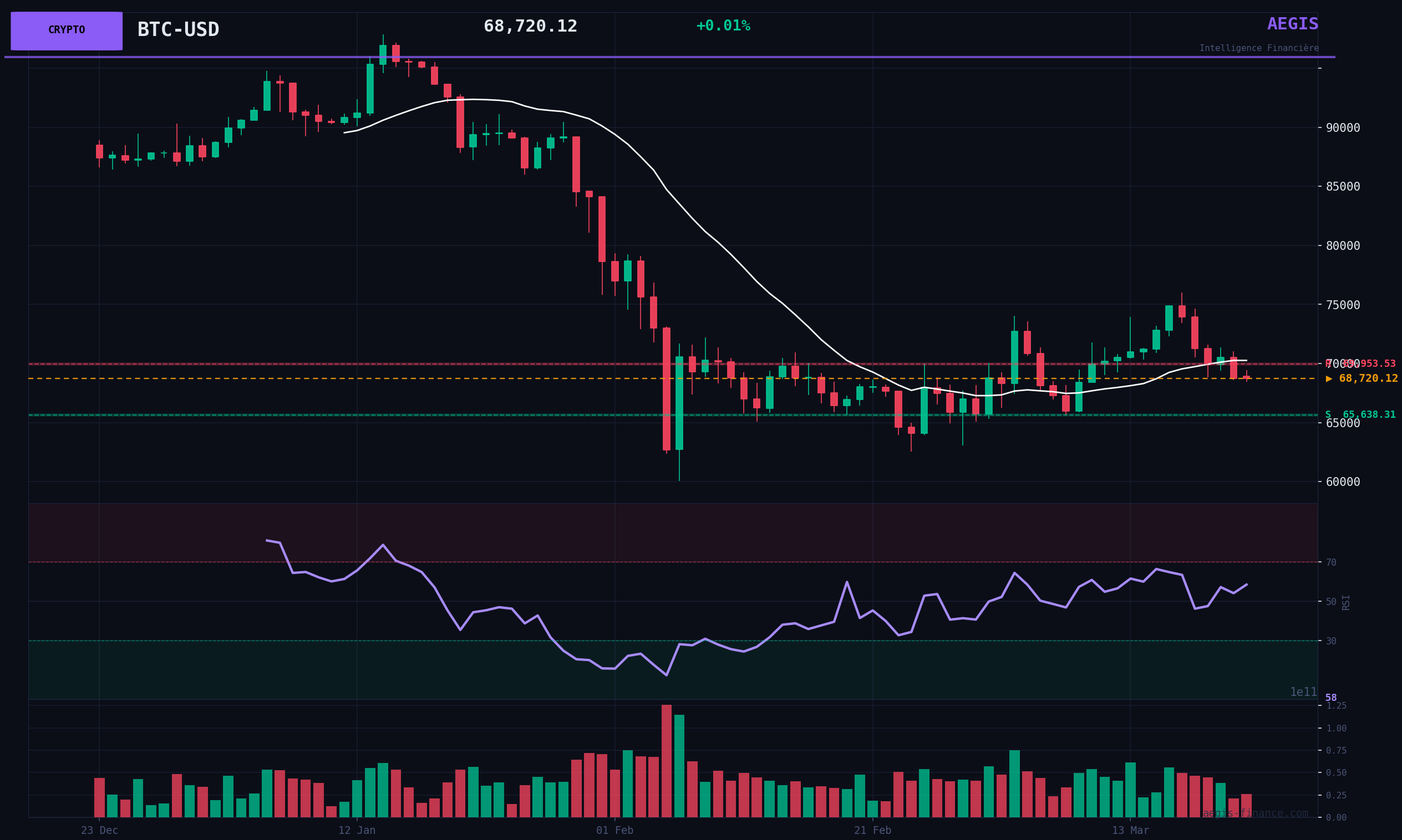 Scénario Haussier (10% de probabilité) : Un retournement de momentum permet une reconquête rapide et en volume de la SMA20 (70 256 $). Ce mouvement, probablement un short squeeze, nécessiterait un catalyseur externe fort, comme une annonce macroéconomique majeure ou un afflux soudain de capitaux institutionnels.